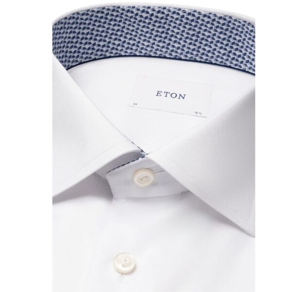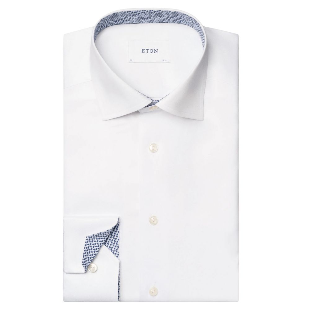 Eton most iconic shirt is refreshed for the season with a geometric leaf print inside the collars and cuffs. Together with white buttons, this detail adds a stylish twist to the classic white shirt. Made from Signature Twill fabric which combines outstanding wrinkle-resistant performance with fine texture and comfort, in 95% Organic cotton for a more sustainable option.
