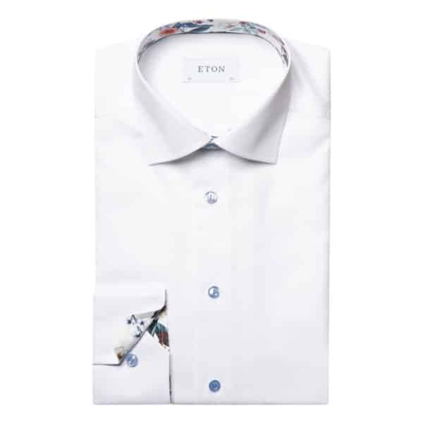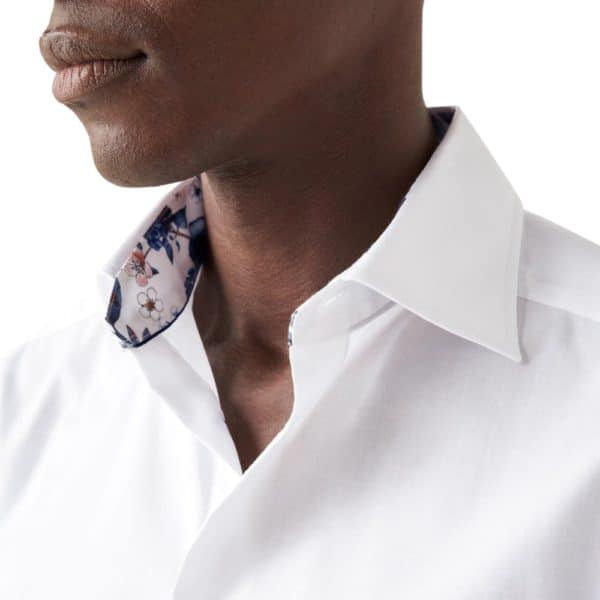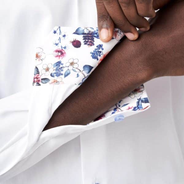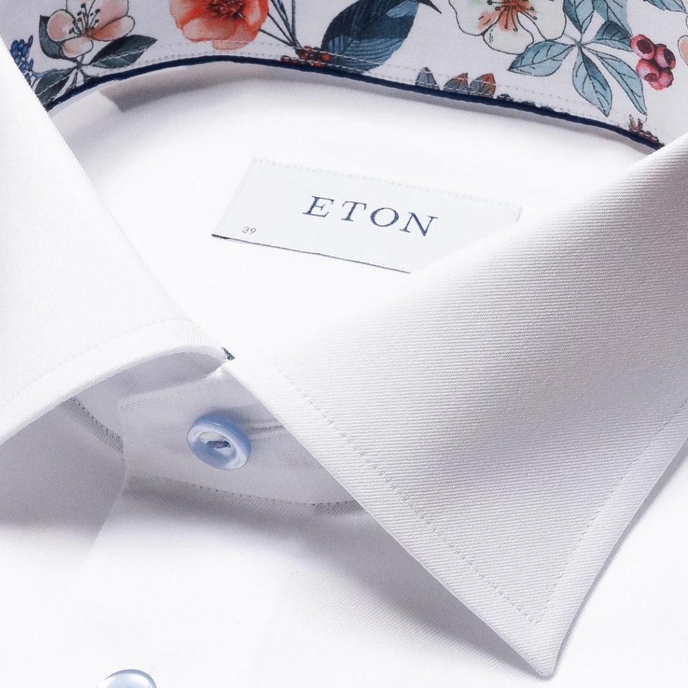 An elegant white formal shirt, crafted from our 100% cotton Signature Twill woven in Italy. This exquisite piece features floral contrast details in the collar and cuffs and is adorned with light blue buttons, offering both style and sophistication.