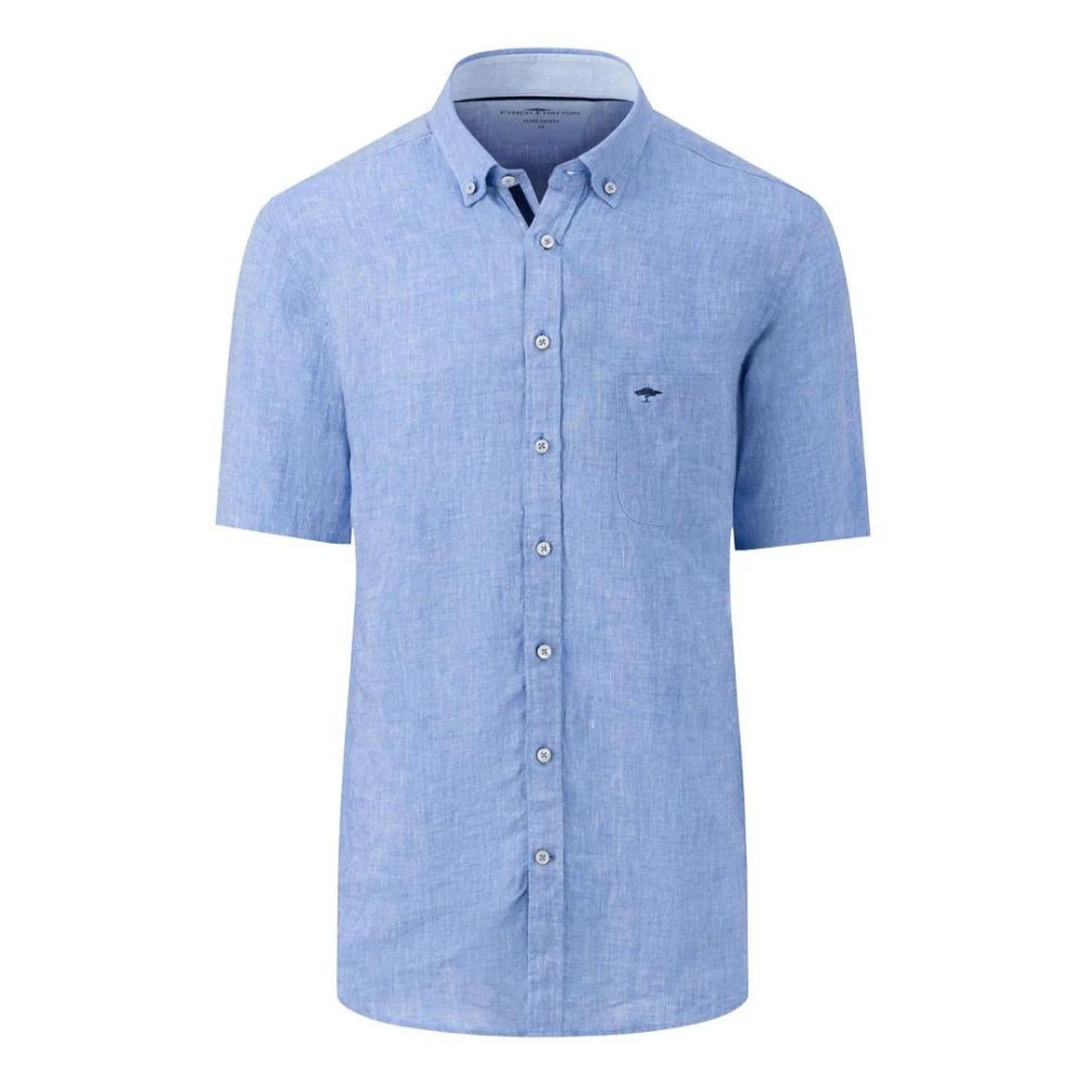 Fynch-Hatton Mini Check Linen Blue Short Sleeve Shirt