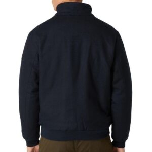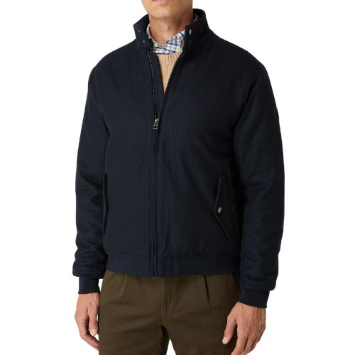 The Fynch-Hatton navy wool bomber jacket with full-zip front and button pockets. Not only feels warm and snuggly but is wonderful to wear. Very comfortable for Autumn Winter with zip inner pocket, 2 popper collar and elasticated waist and cuffs. A thermal Sorona insulation inside ensures the highest levels of soft inner comfort and warmth.