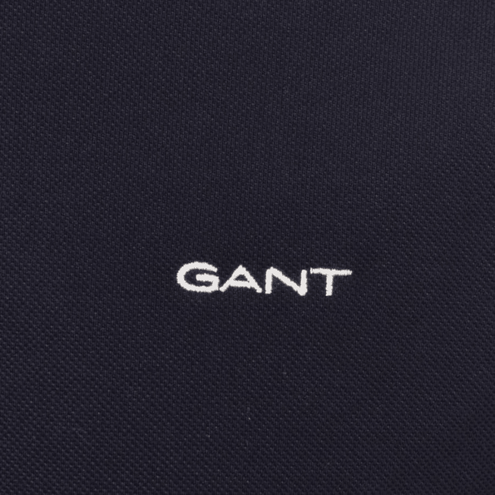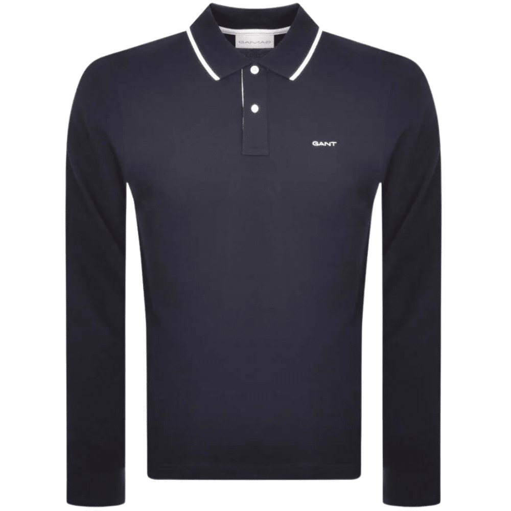GANT Cotton Pique Long Sleeved Polo Shirt In Evening Blue. A classic pique polo shirt with a two branded button opening in white and a ribbed polo collar featuring a woven knit design and navy tipping.