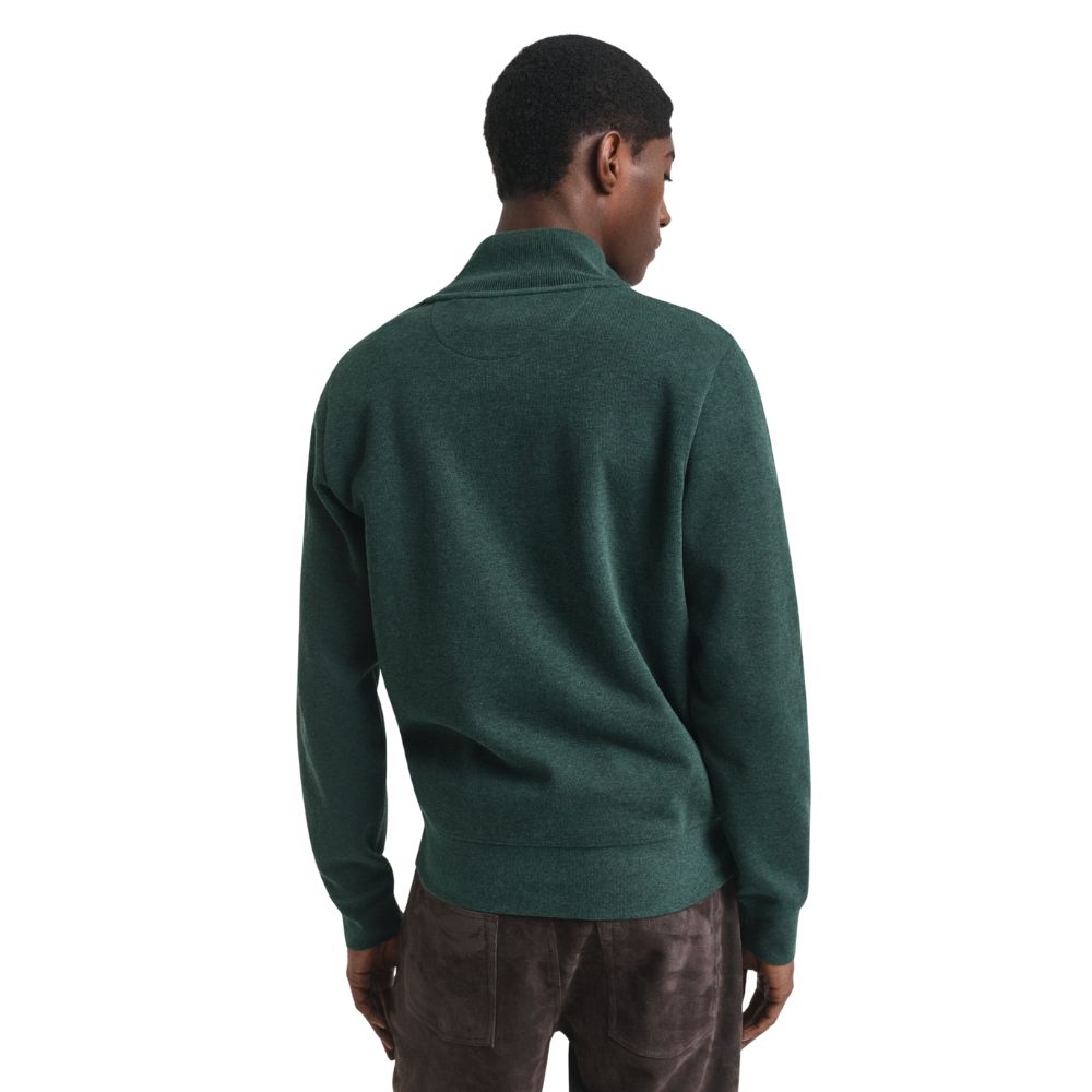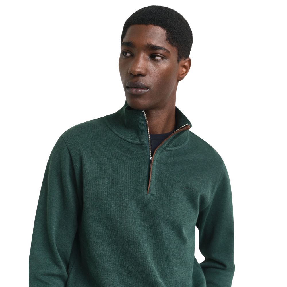 Dressier than a sweatshirt but just as comfortable, this green half zip is perfect for layering over shirts at the office or over T-shirts on the weekend. Cut from 100% cotton with a soft hand-feel, it is designed for a regular fit with a half-zip collar. Details include imitation suede detailing, a silver metal zip and a tonal GANT logo embroidered at the chest.
