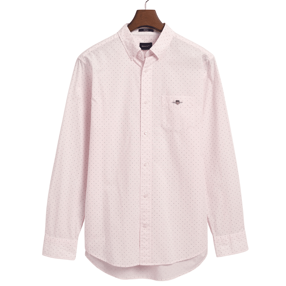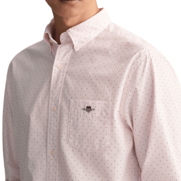 A playful spin on formal business attire, this regular fit shirt is a timeless staple for any wardrobe. Designed with a dot print on poplin banker stripe cotton, this shirt features contrast fabric at the inner collar stand and cuffs. Further details include a classic button-down collar, a box pleat and locker loop at the back and our signature Archive Shield embroidered at the chest pocket.