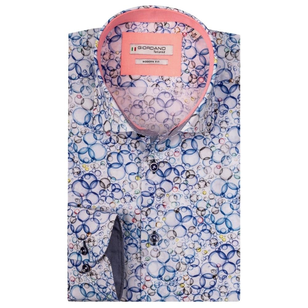 The Giordano brand is driven by a simple idea and never stops creating. It is the vision of Roberto, the designer who has led the brand since the beginning. This blue shirt features a bubbles print, great for casual look or dress it up with trousers. Made from 100% cotton giving you a breathable feel.