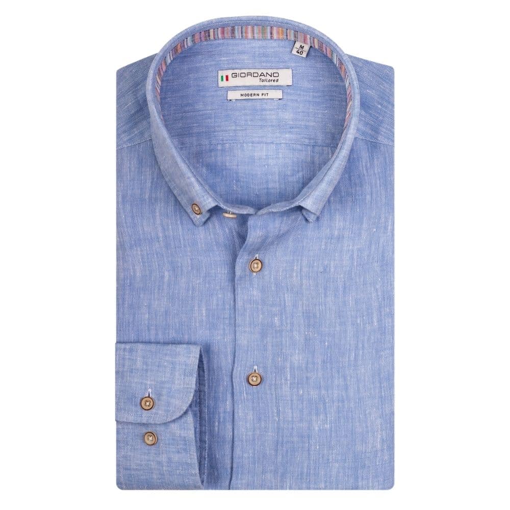 This Giordano washed linen blue shirt is finished with a smart button-down collar, colourful contrasting collar detail and tort buttons.