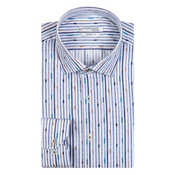 The shirt by Giordano is a stylish and cool shirt, featuring a modern fit, cutaway collar, with blue coloured stripes. Pair this shirt with one of our jeans or trousers as well our selection of jackets for a sharp, well dressed look.