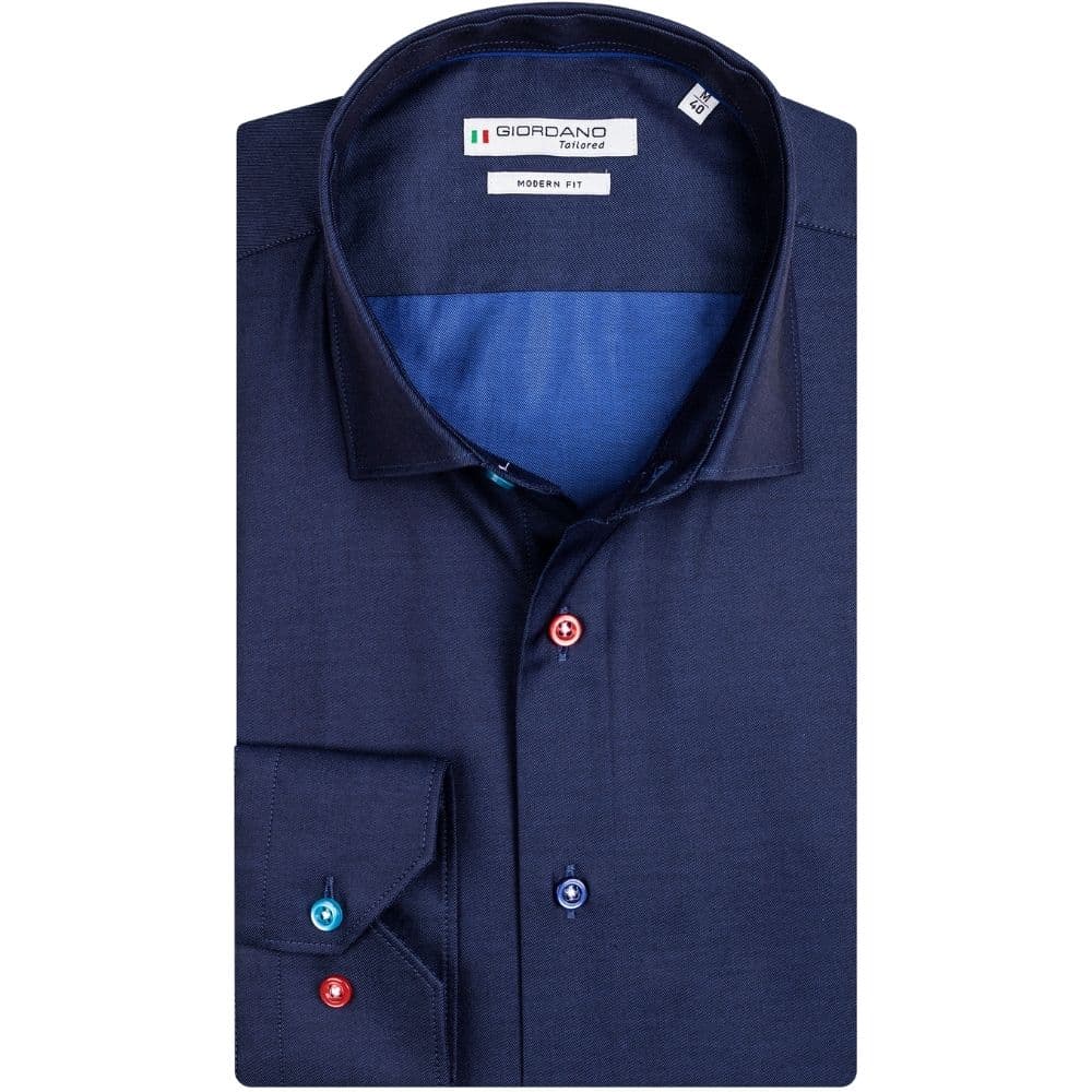 A crisp Navy fine twill, long sleeve modern fit shirt. Popping multicolour button shirt, able to make anyone envious of your button game. A great subtle but eye catching garment for smart casual occasions.