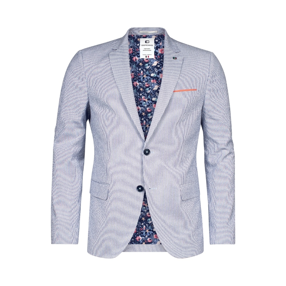 The is a modern fit seersucker blue jacket expertly constructed in a wool mix with signature Giordano deep sea theme at the chest pocket and inner lining. Classic front flap pockets and tonal buttons complete this smart tailored jacket. Team the jacket with your choice of chinos and a shirt for a smart casual look or style it with jeans and a t-shirt at the weekend.