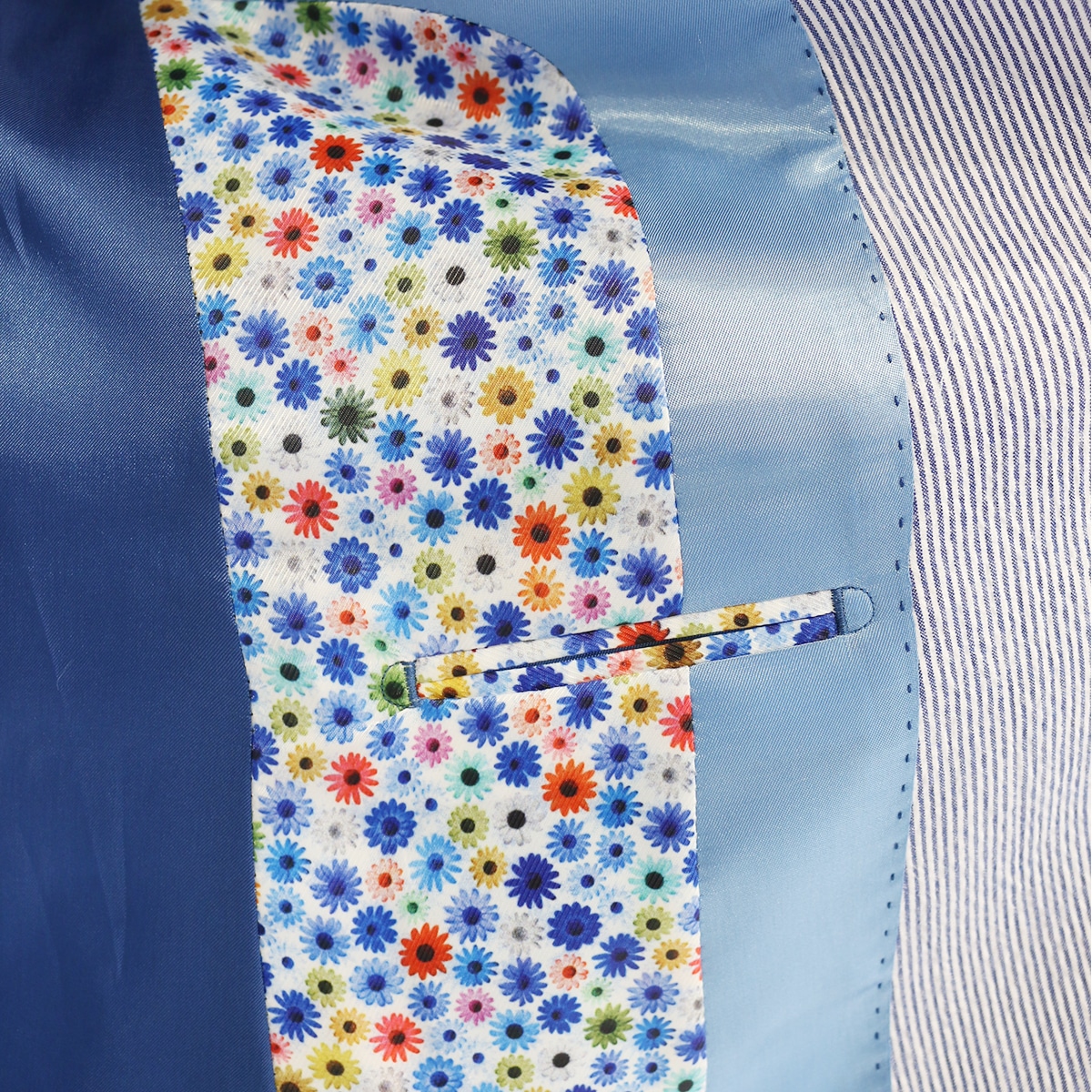 This navy/white striped blazer jacket by Giordano has a fancy lining and side vents. Its cotton mix seersucker material is ideal for Spring/Summer.