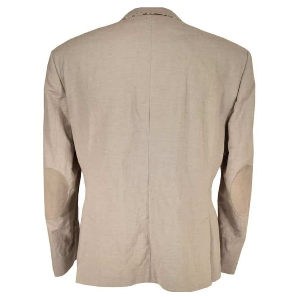 The Holland Esquire Pipe Trim Smart Jacket in Sand colour is a stylish, quirky take on sophisticated dressing. Made from a lightweight cotton and linen blend fabric, this jacket is suited for warmer temperatures. Featuring a single breasted shape, this jacket has a two button front complete with notch lapels aswell as patch pockets, chest pocket and also interior pockets. Handsome details feature on this jacket, including a piped trim on the lapels with a stripe patern; this trim also features on the buttons. The elbows feature suede textured patches whilst the lapels, chest pocket and flap pockets have stitched edges for a cool design touch. For added flair, the lining of the chest pocket can be pulled out to become a pocket square.