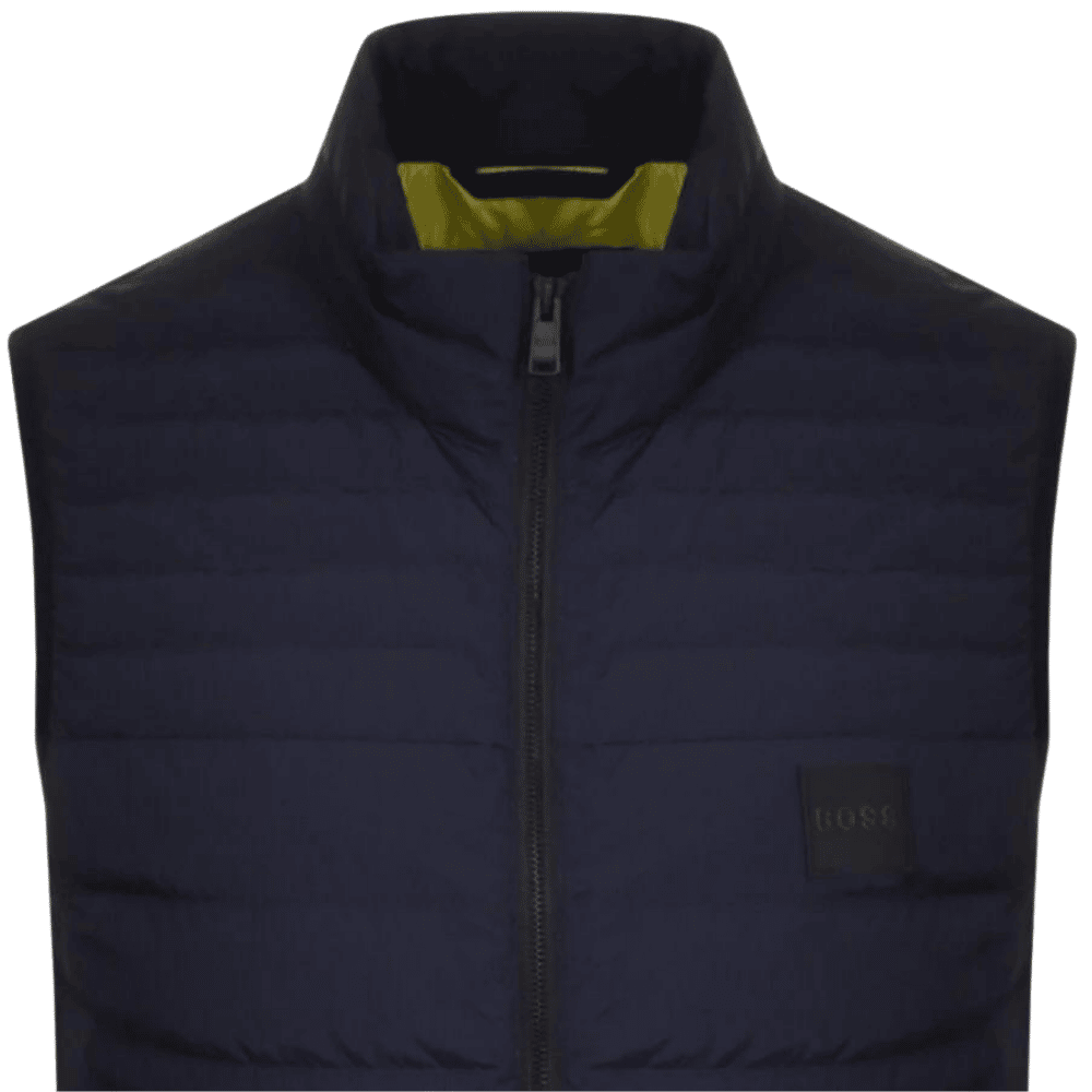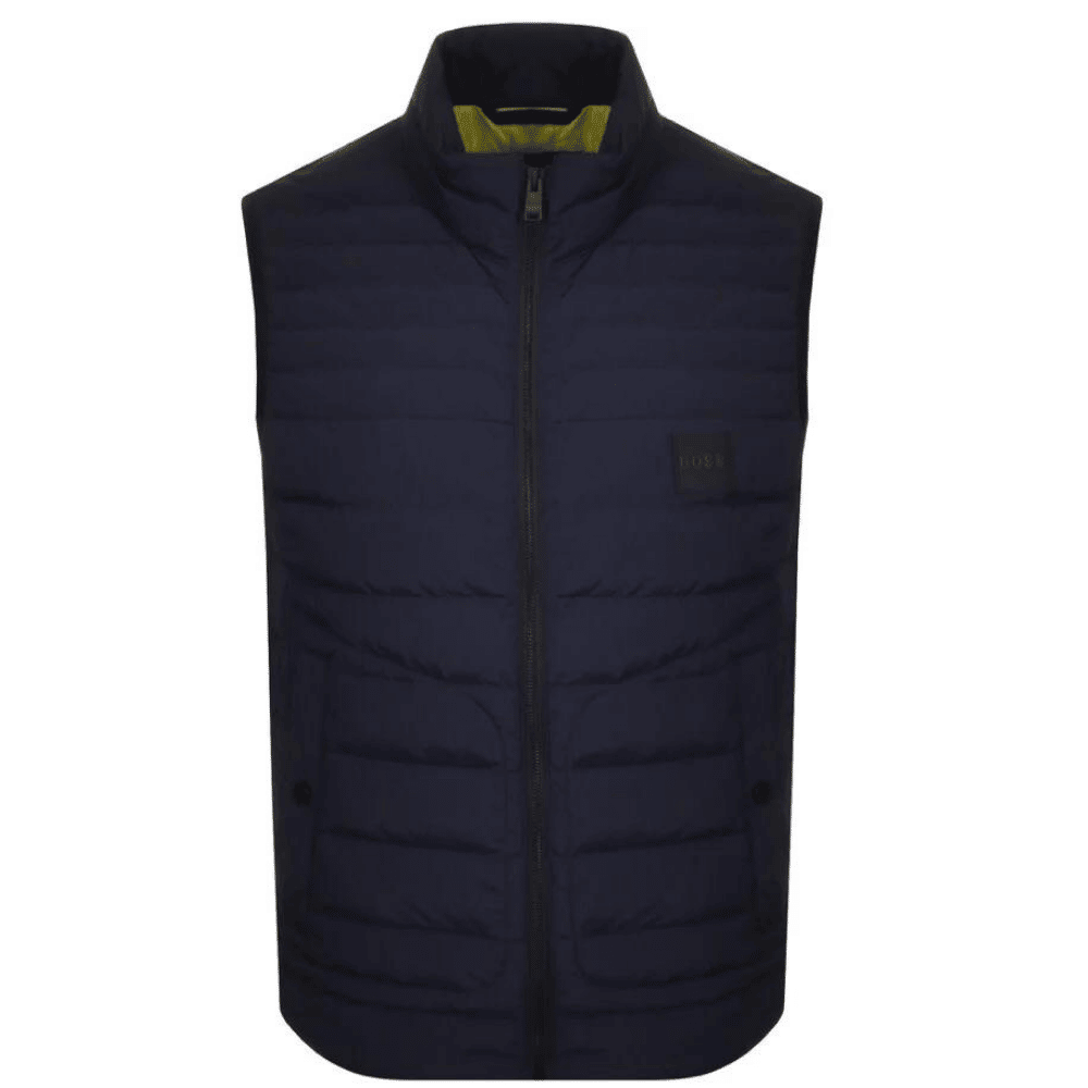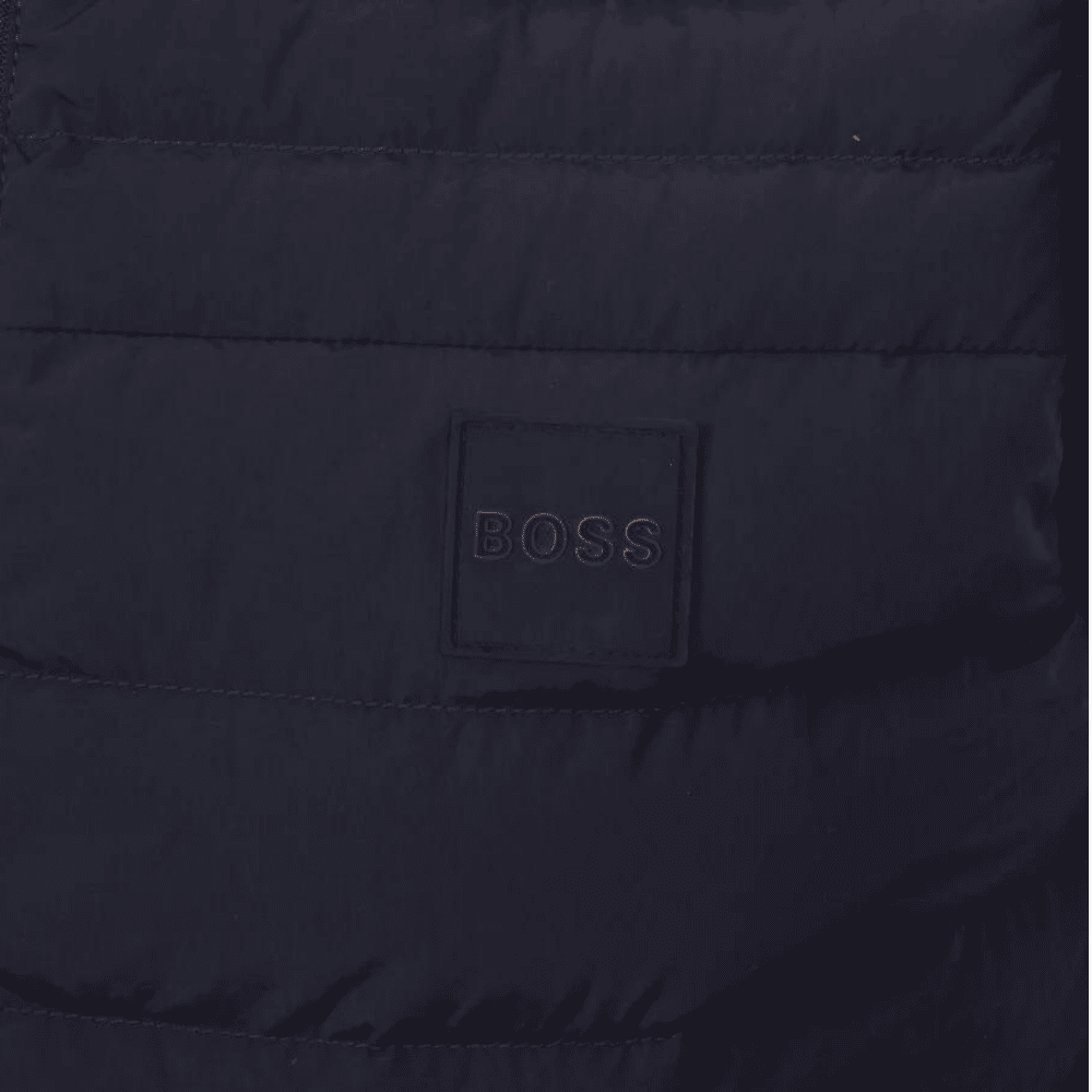 A Navy duck fibre down gilet by Boss Menswear featuring a zip closure with a square Boss Orange logo on the front left breast. A lovely garment to keep you warm through the winter months, Perfect for those lovely dog walks and everyday use.