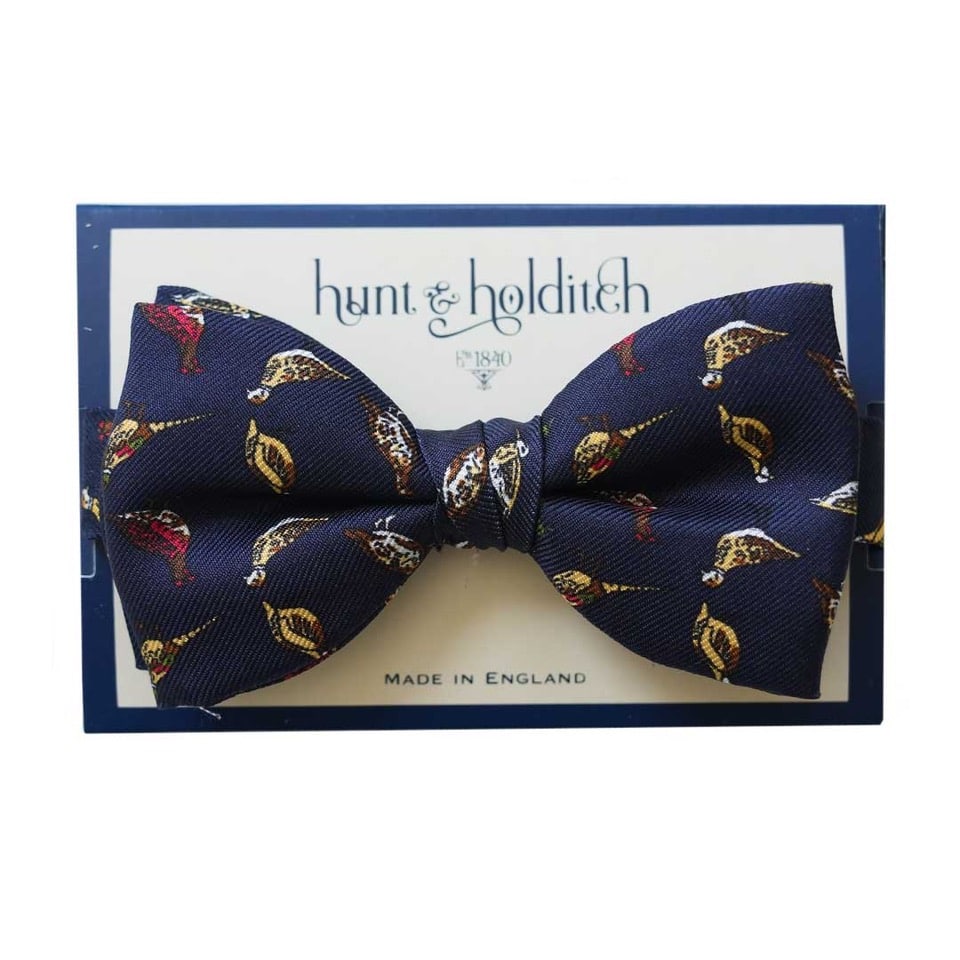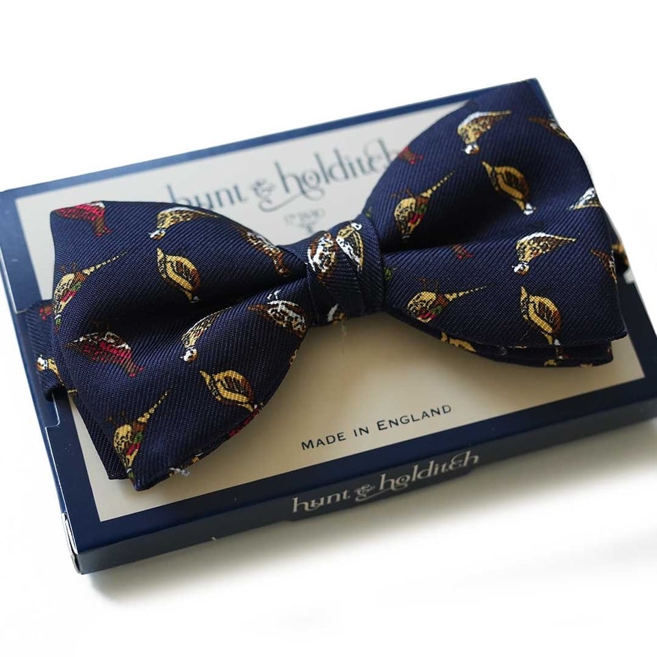 Hunt & Holditch Navy waterfowl birds pre tied bow tie. This bow tie is made with 100% silk and and produced here in England.