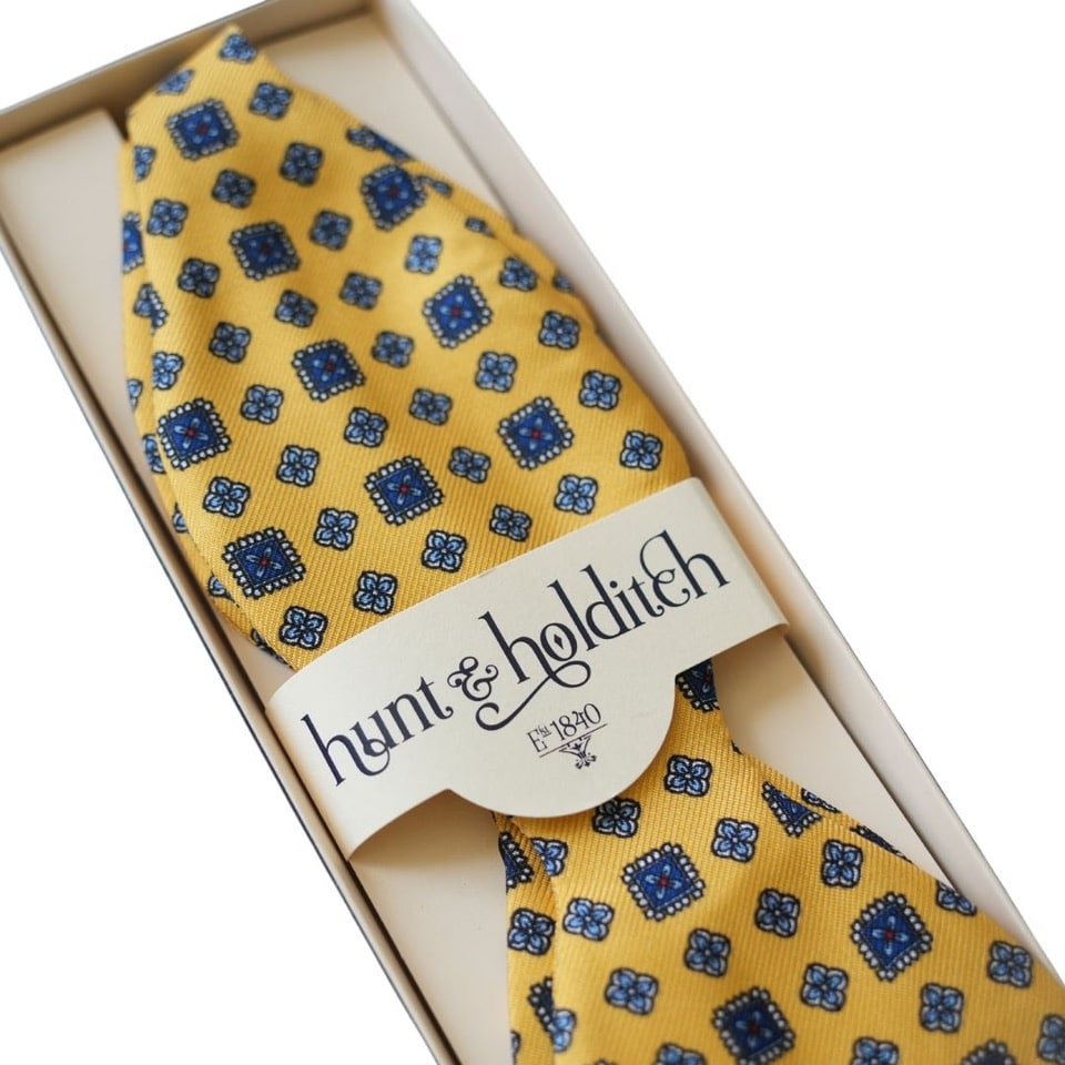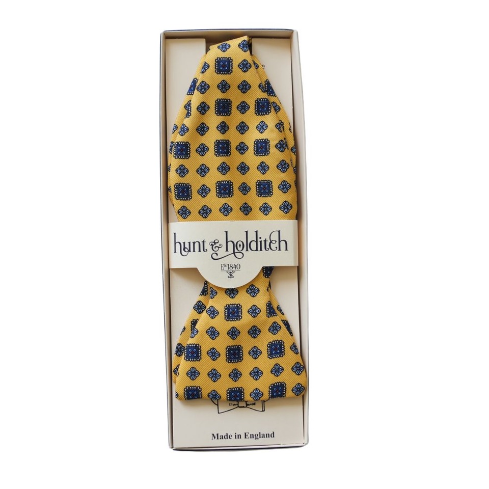 Hunts & Holditch range of bow tie shapes and fabric types is extensive. They are self-tie in a narrow style, as worn by Daniel Craig in SPECTRE. This bow tie is made with 100% silk and and produced here in England.