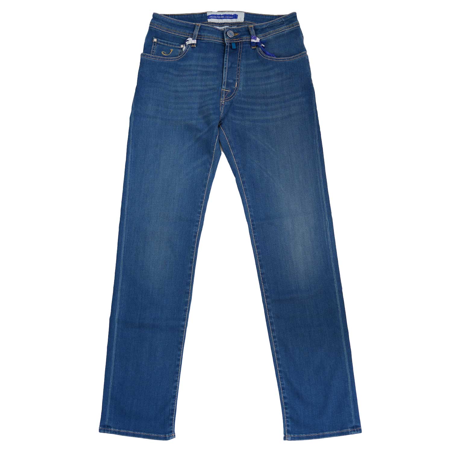 Featuring a button fly, classic five pocket design and branded waistband tab. All Jacob Cohen jeans come complete with a signature complimentary pocket square to accessorise your looks.