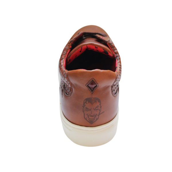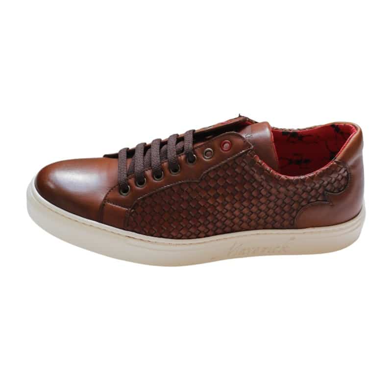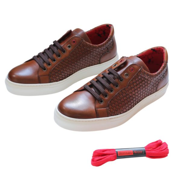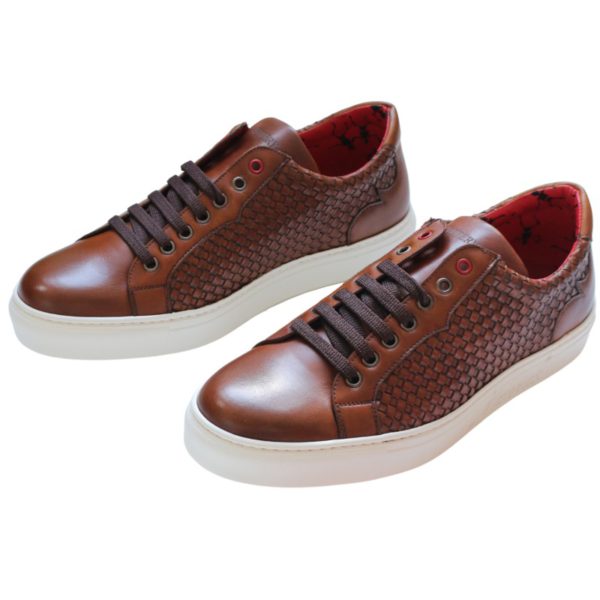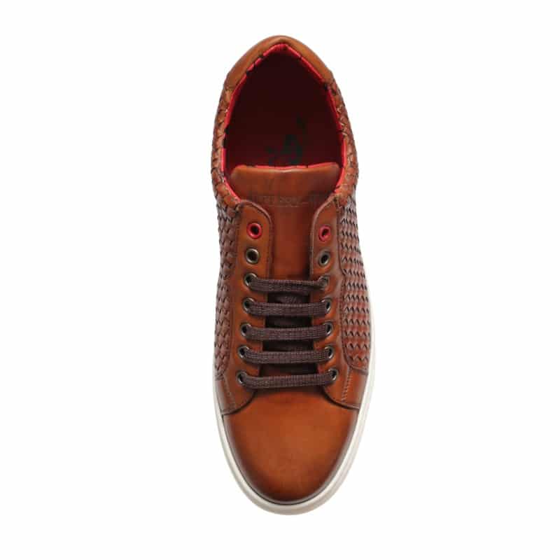 Antique Castano tan calf cup sole trainers with hand woven leather side panels.