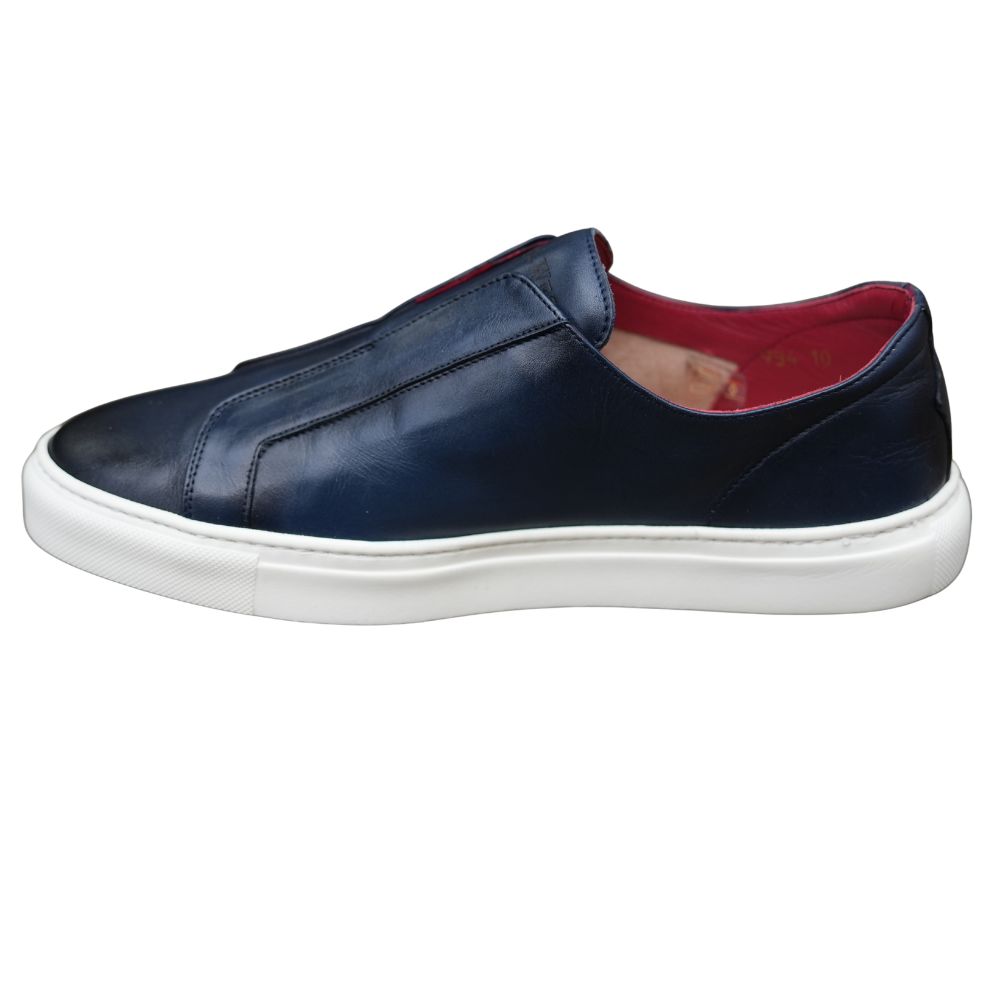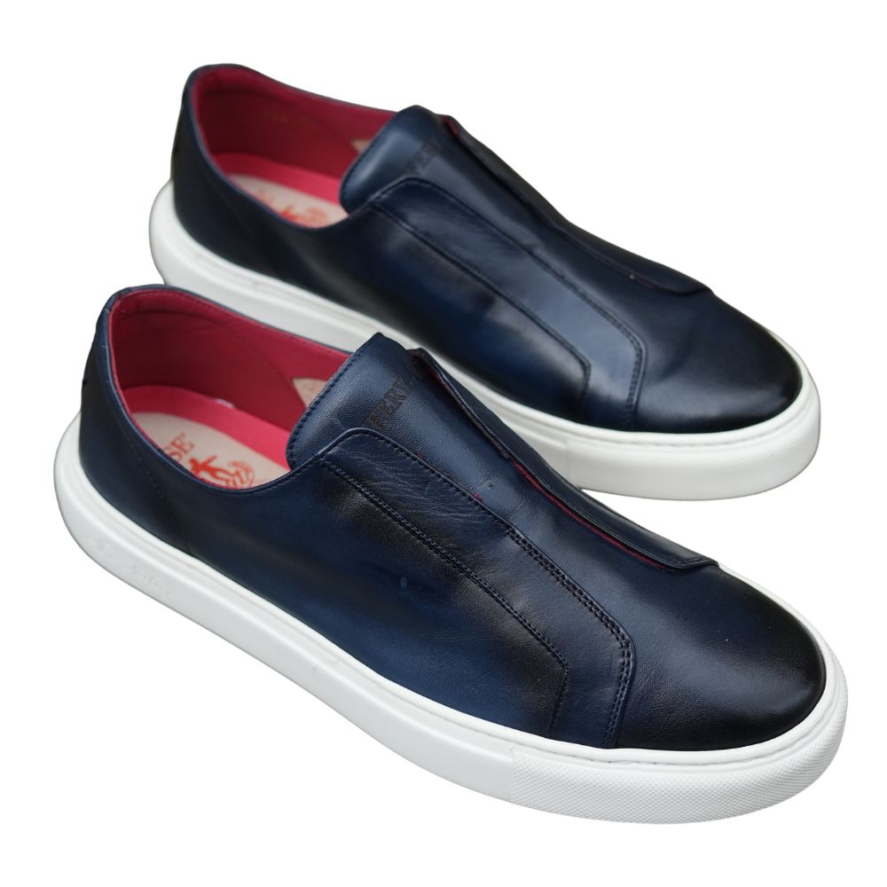 This Jeffery West dark blue laceless trainer combines a sleek navy leather body and a crisp white sole to create the perfect balance between smart and casual footwear. This shoe offers versatile style that works just as well at a dinner party as it does while traveling, bringing comfort and sophistication to any modern wardrobe.