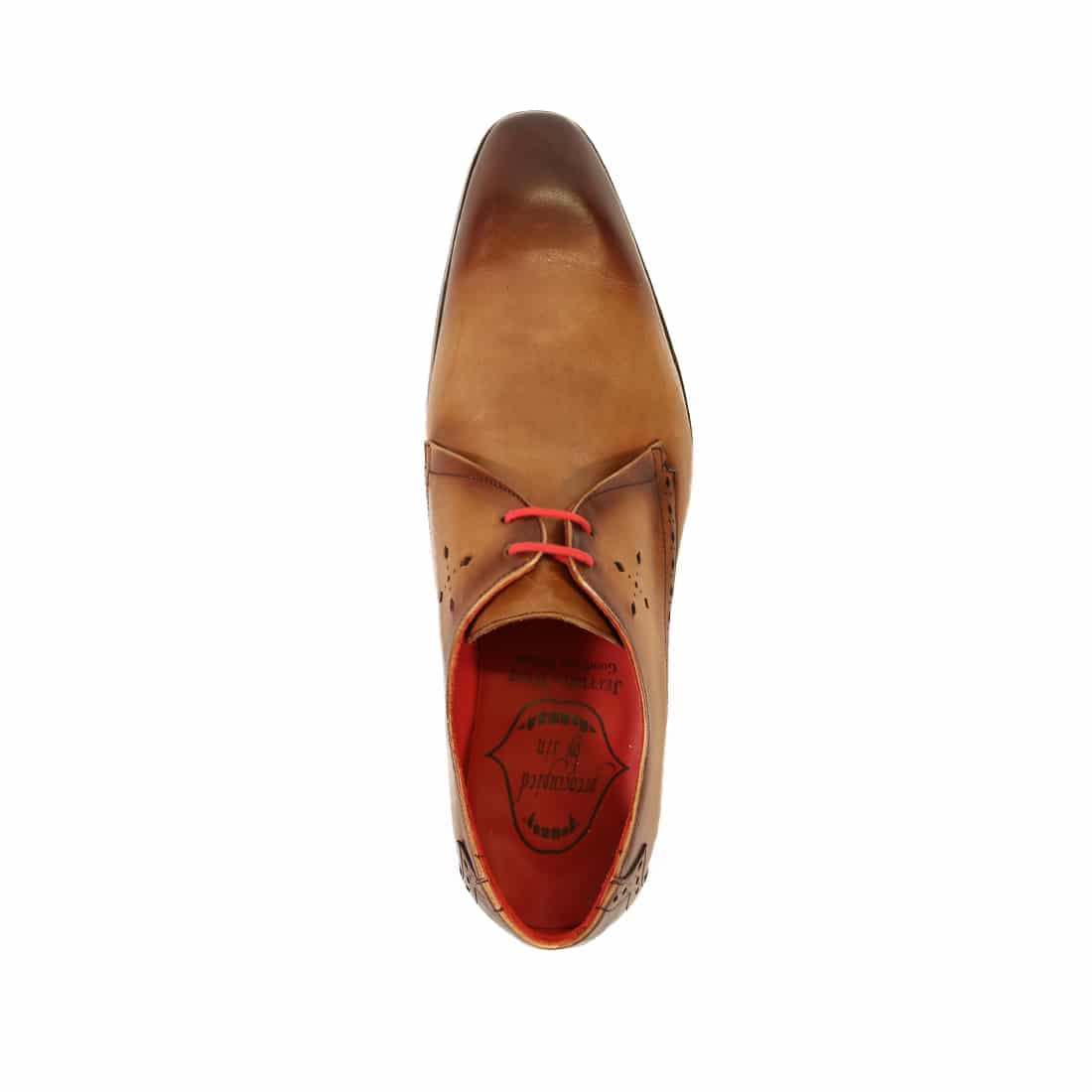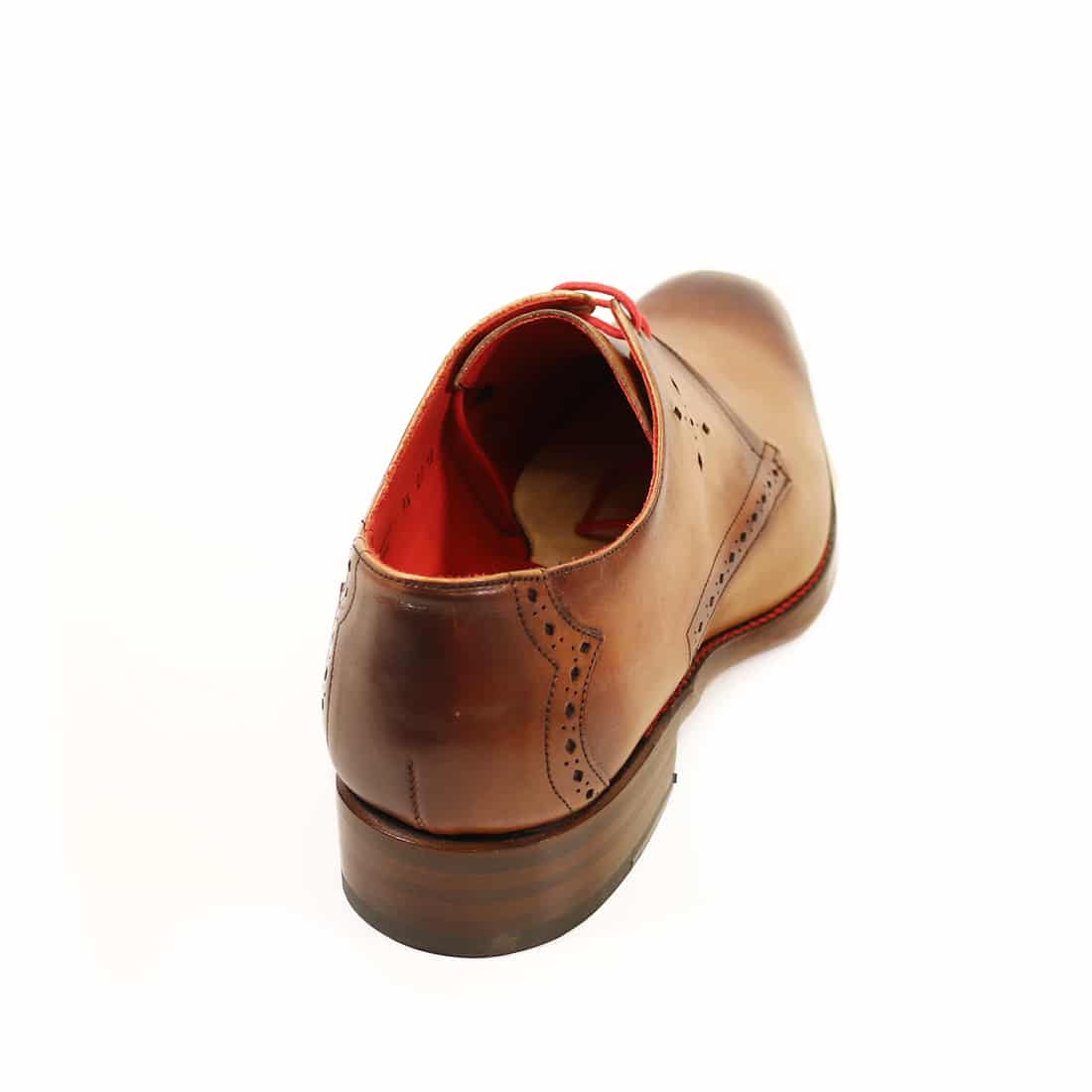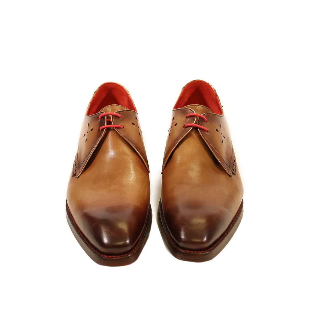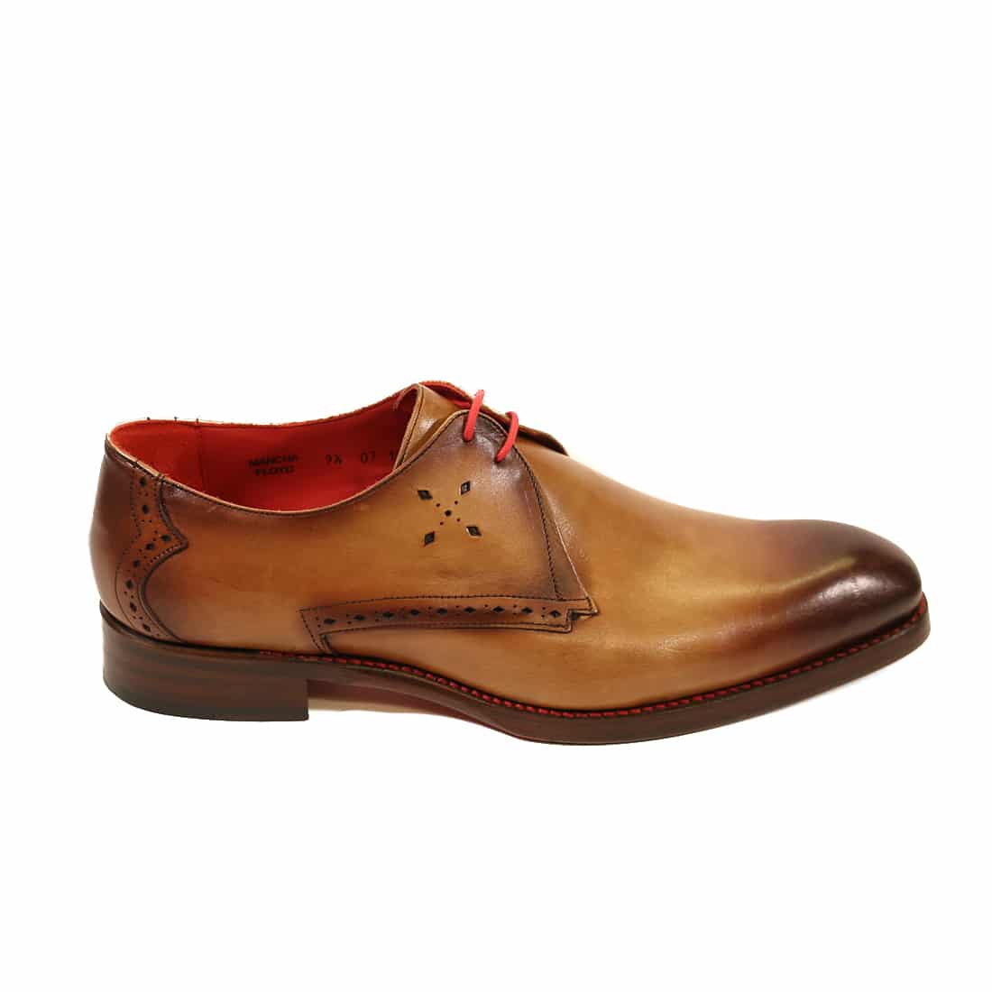 Introducing the MANCHA Two eye Lace Up Gibson on the new last FLOYD – made in hand coloured Calf with Shadow Burnishing effect with red laces and welt stitching, diamond punched quarters and a sleek plain toe