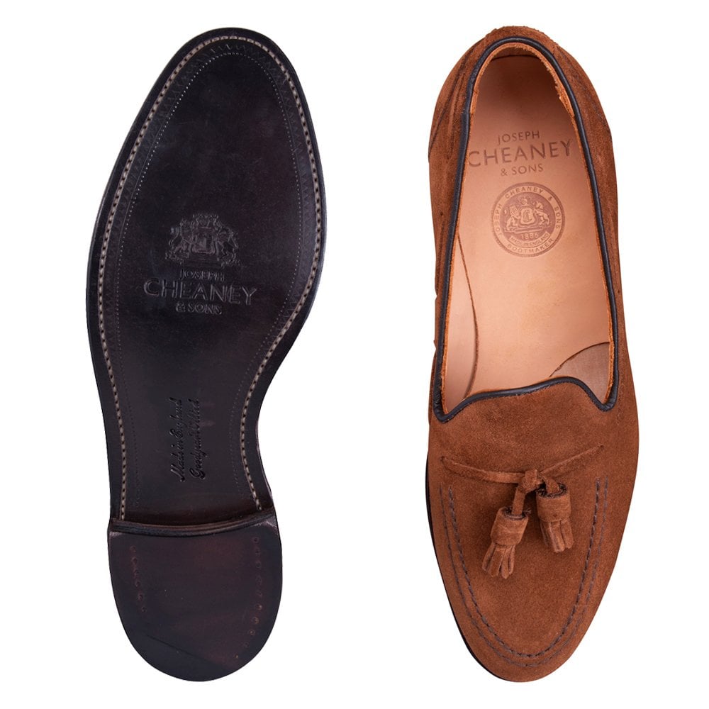The Cheaney Harry II tassel loafer is refinished in a sumptuous fox suede and constructed on the 146 last. Fully handcrafted in the Cheaney Northamptonshire factory.