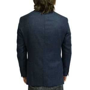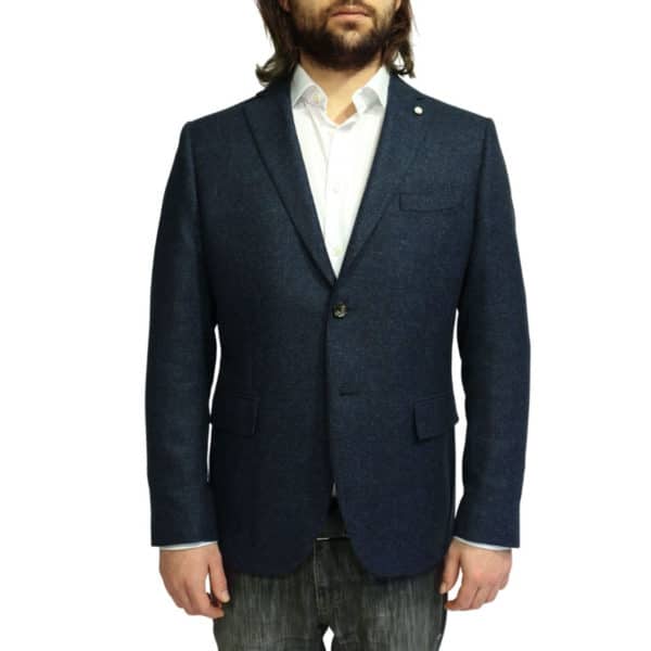This Premium Lubiam Navy Jacket in wool, cotton and cashmere has a zip out front panel, flap pockets, and the fabric features a small check.