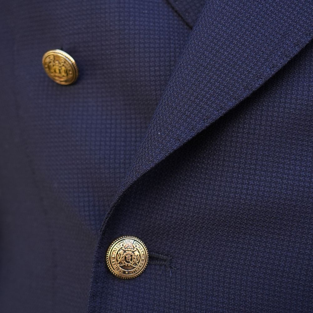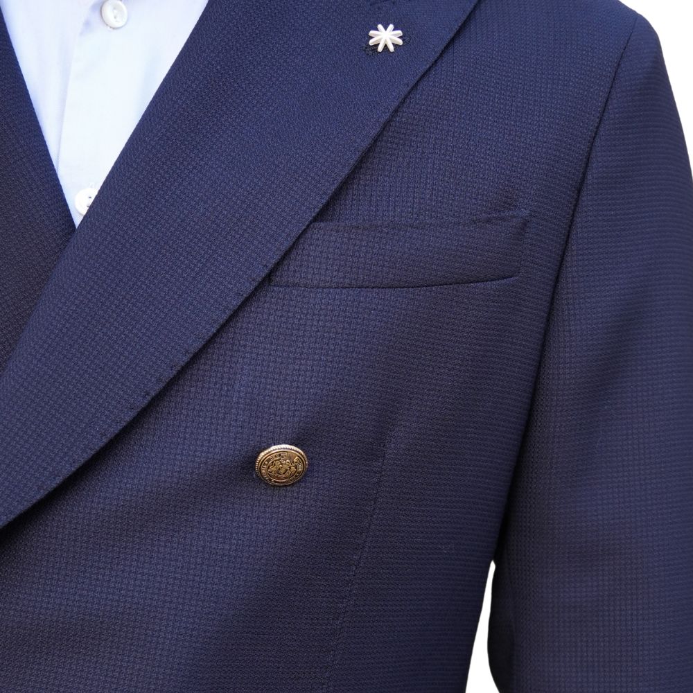 Manuel Ritz is known for exciting styles with Italian fabrication and flair. This Double Breasted Blazer is a uniquely textured, lightweight virgin wool fabrication with bold gold buttons, peaked lapels and unstructured and unlined exposed handwork making this item particularly breathable.