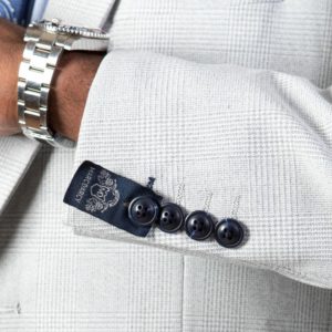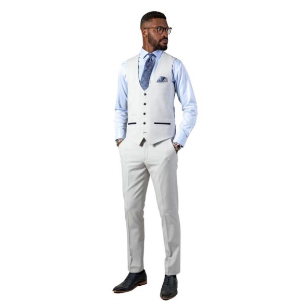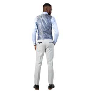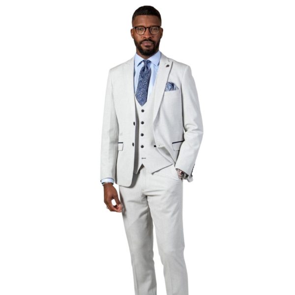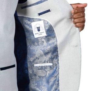 With its neutral colour and slim fit, this stylish men’s three piece suit will be a popular choice for weddings and special occasions. laden with a subtle Prince of Wales check it embodies classic formalwear and refinery. The navy coloured velvet accents add a contemporary edge whilst the added elastane in the fabric ensures comfort and flexibility.