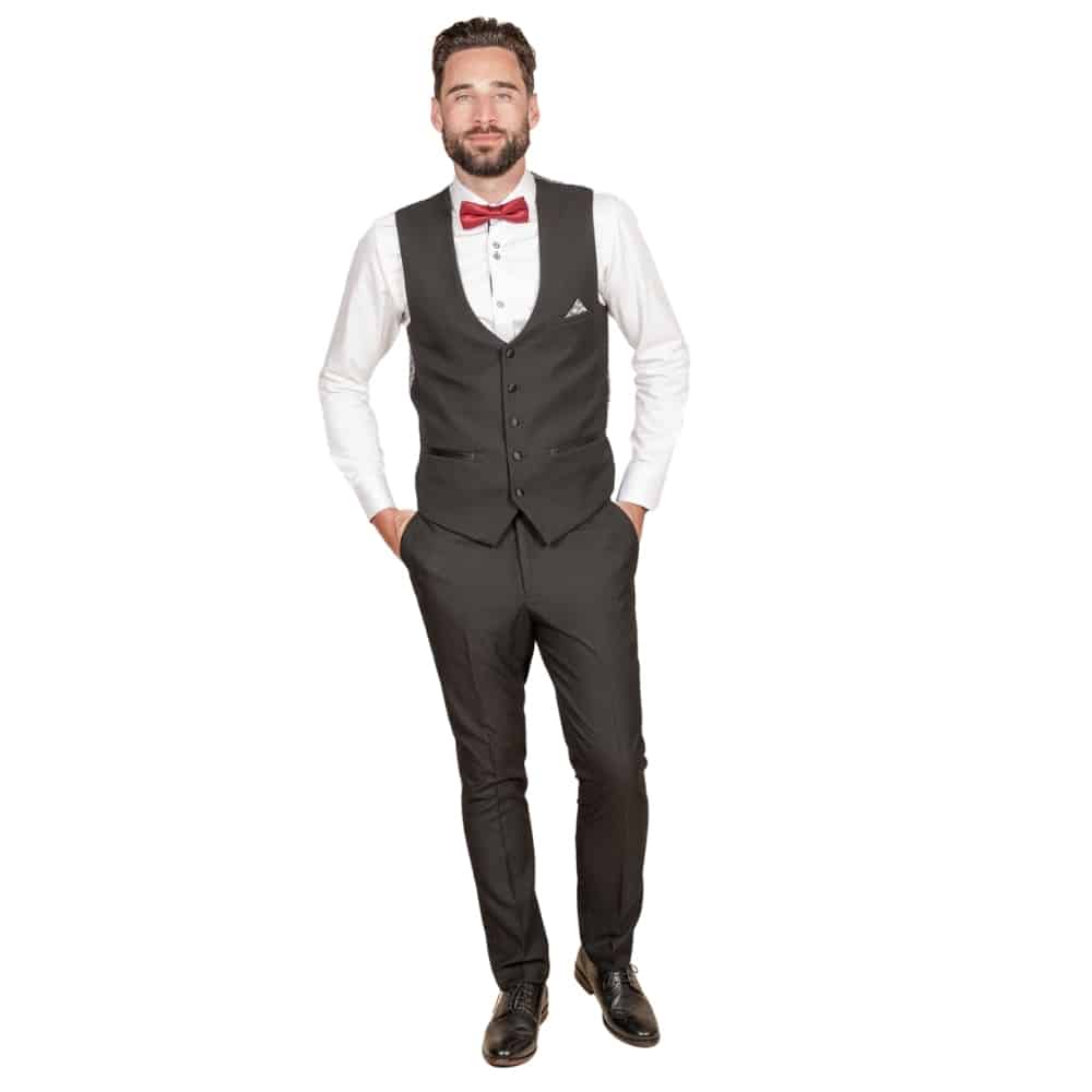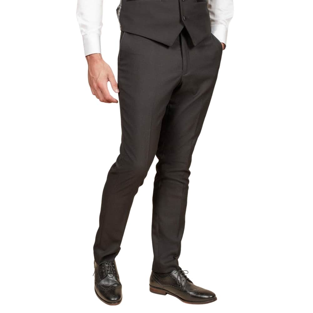 Get the party started in this Dalton black dress suit. With a classic silk style peak lapel to the blazer and matching buttons it is perfect for black tie events, just pair with a dapper bow tie and you’ll be dressed to the nines. Featuring a vibrant dual panelled lining with branded Marc Darcy circle print and a complimentary pocket square to match.