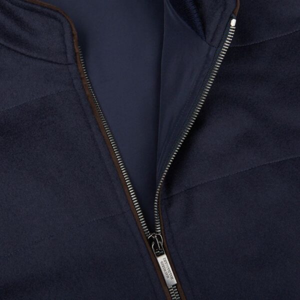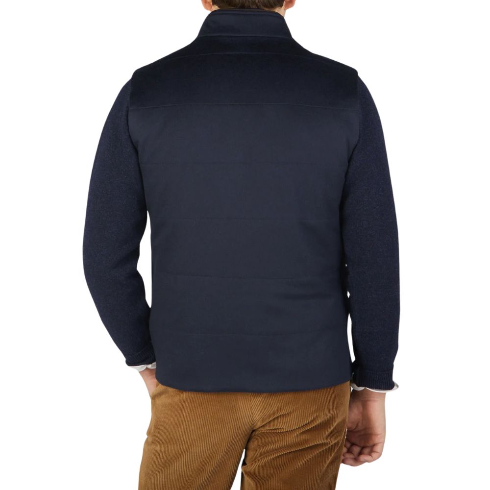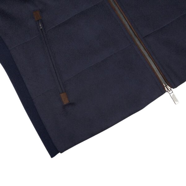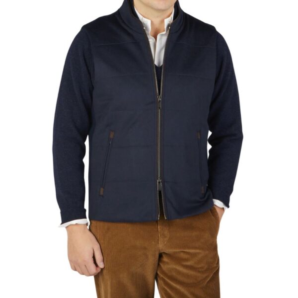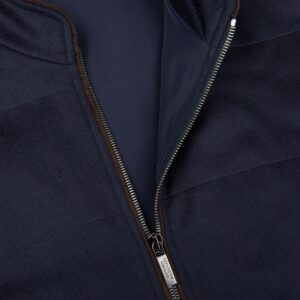 Stay warm in style with this luxurious Maurizio Baldassari navy gilet. Made from pure cashmere, it’s incredibly soft and lightweight, yet three times warmer than wool thanks to its water-repellent finish. The contemporary design features elastic side panels for a comfortable fit over blazers or knitwear, making it a versatile layering piece for the coming colder months.