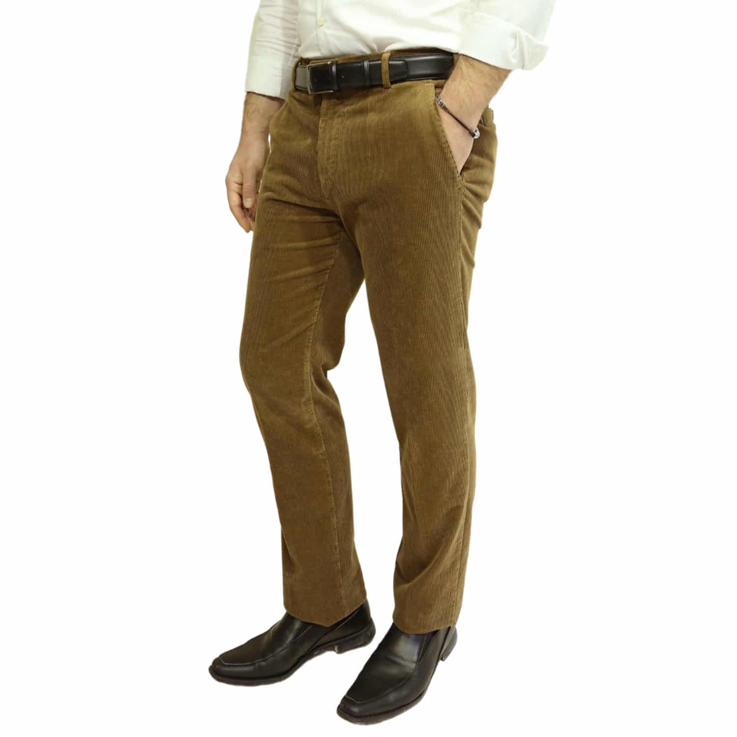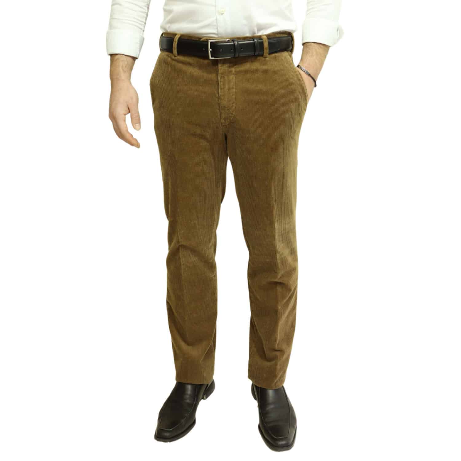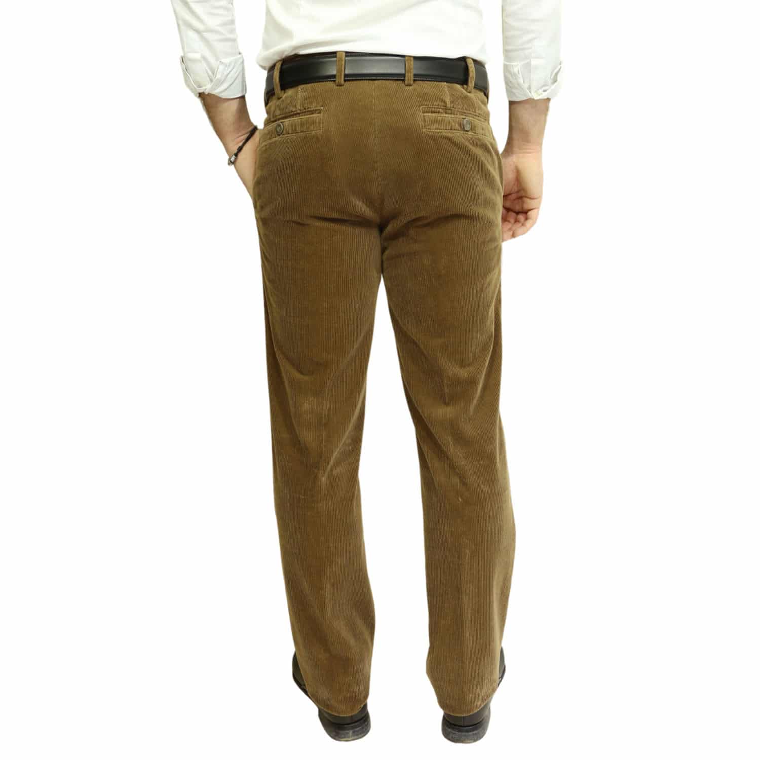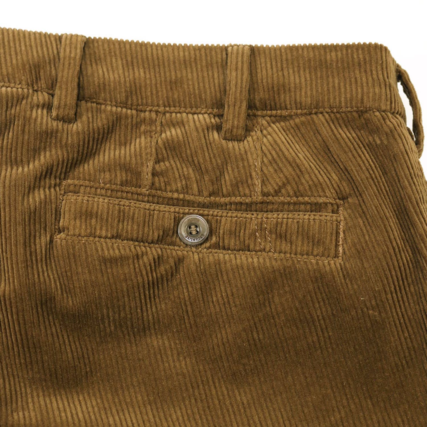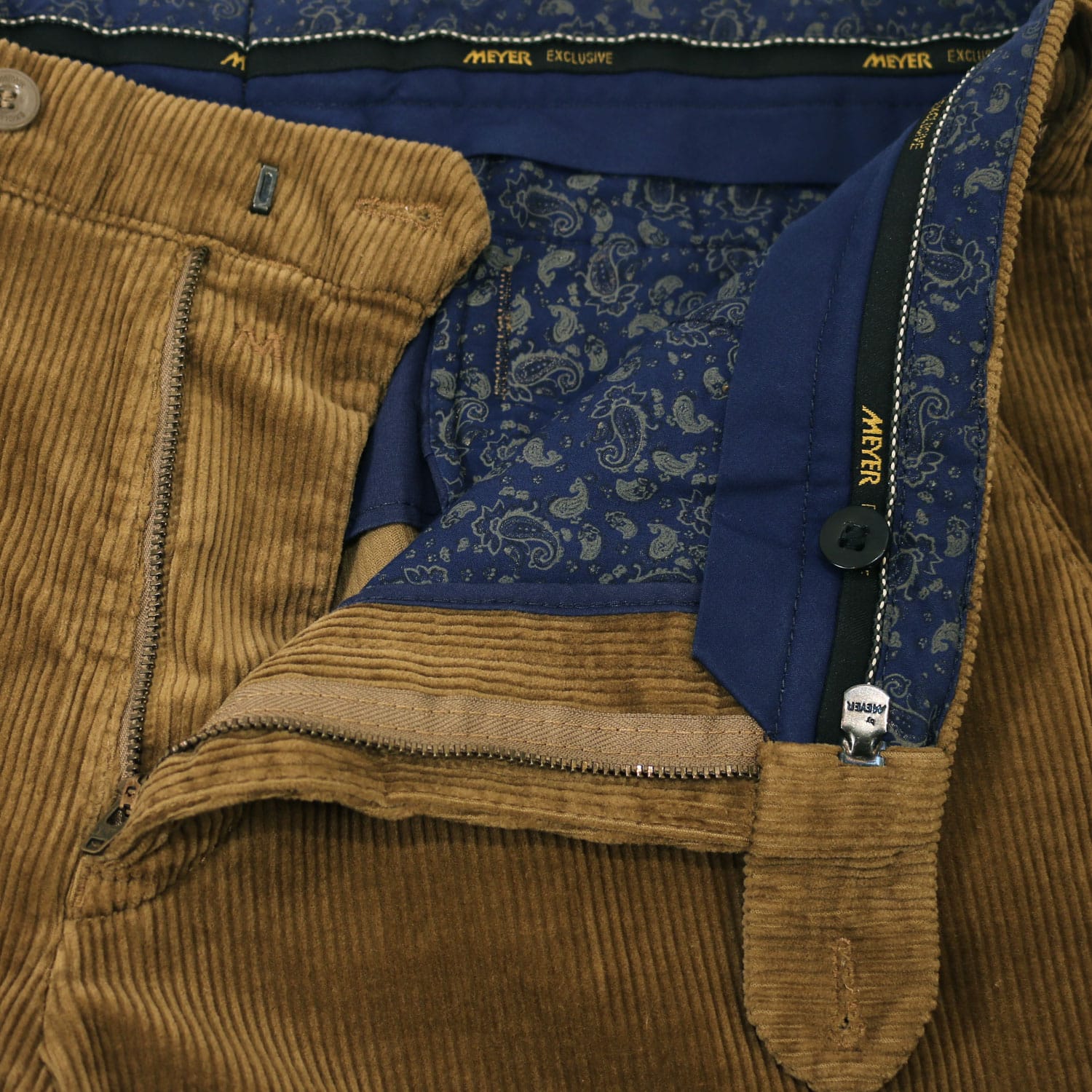 These Meyer New York camel Cords are the perfect basis for your autumn and winter outfits. The New York style is a regular fit, flat front, diagonal pockets with a zip coin pocket in the left pocket, and buttoned back pockets. The fabric is flexible, super soft Corduroy giving a textured and comfortable feel.