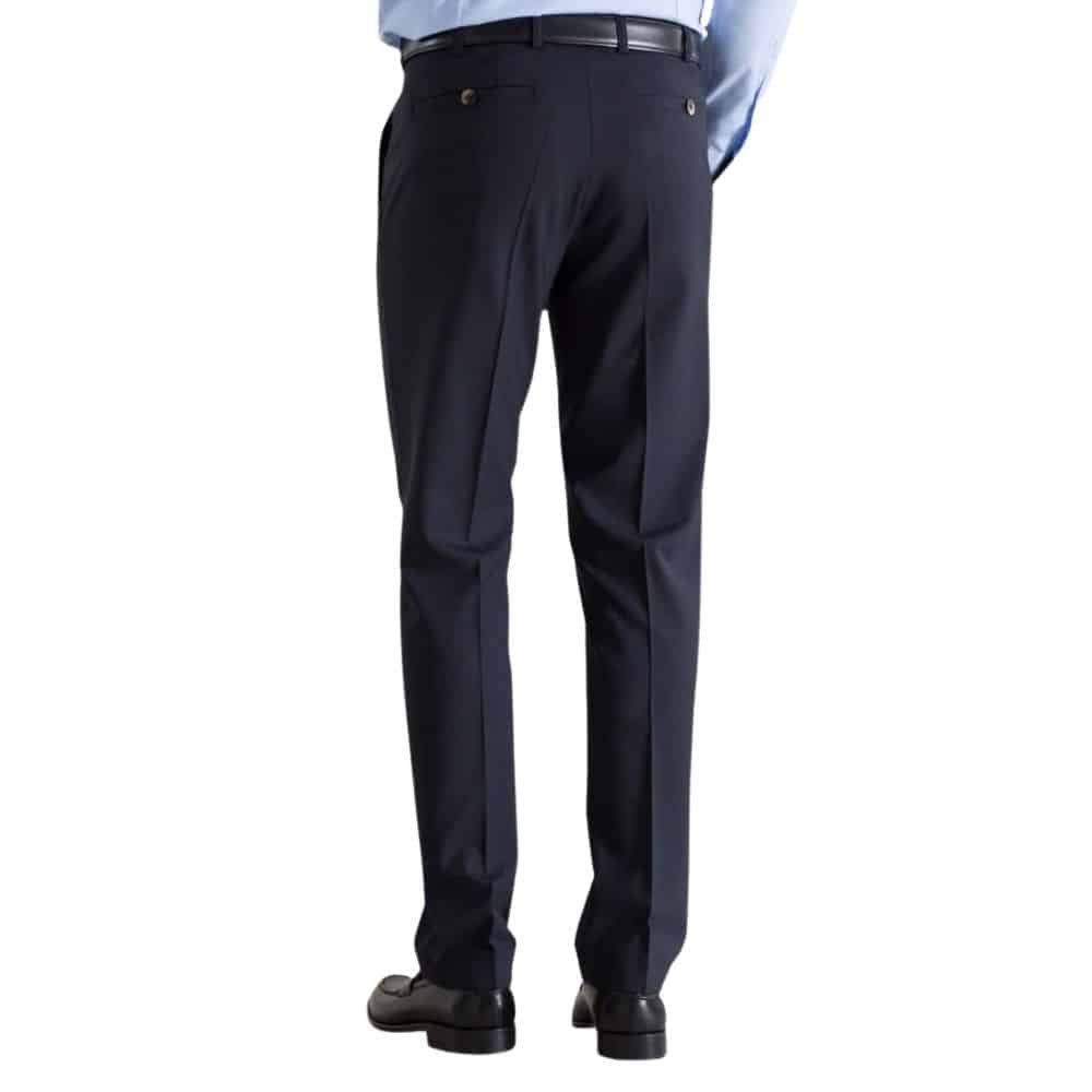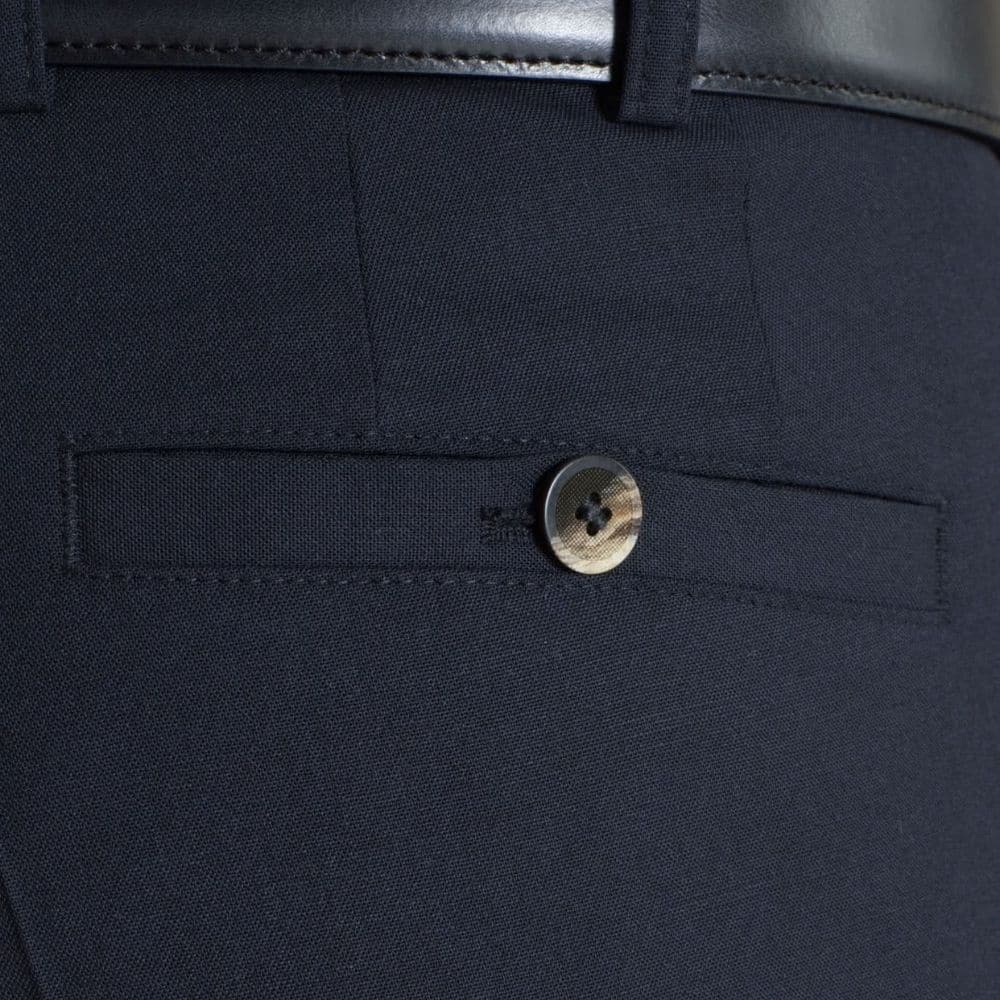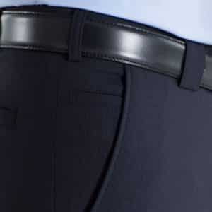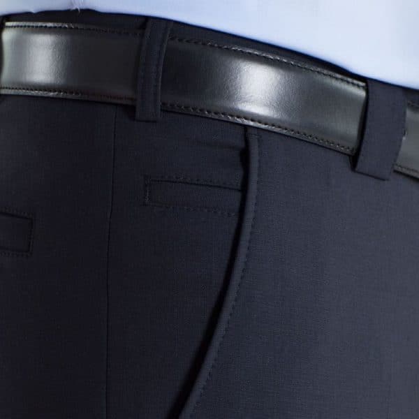 These comfortable men’s trousers are a particular winner with their slim silhouette. The special wool blend is low maintenance and may be washed with household linen. With its special, elasticated band, manufactured here, the trousers stretch several centimetres when under stress and thus remain particularly comfortable. The coordinated pocket lining and the high-quality buttons complete the classy look. The ideal belt to complement this trouser is a black, stretch leather belt from our current range.