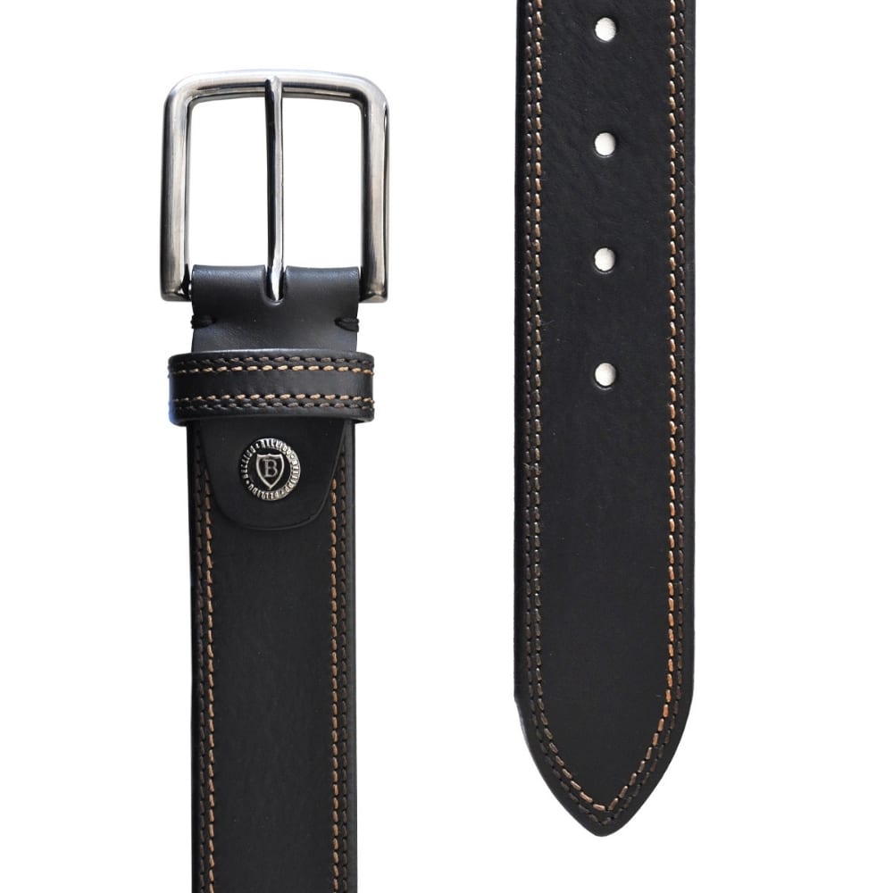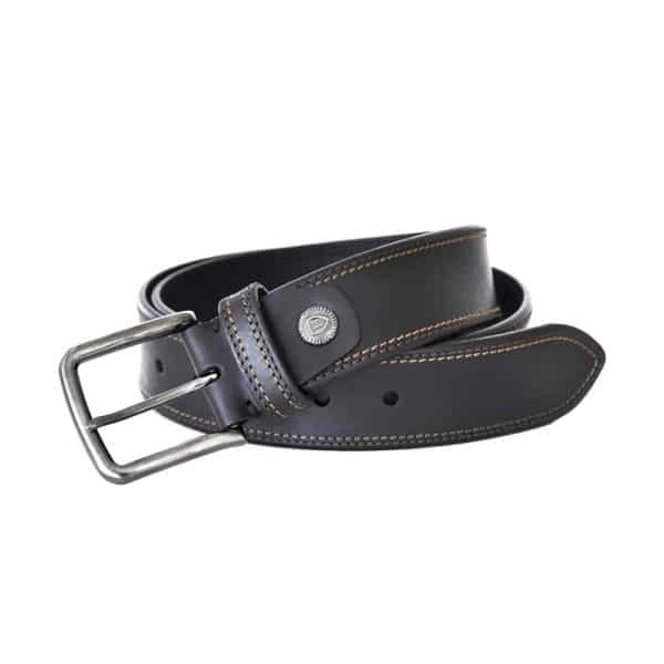 Cowhide belt made in Spain. The design stands out with the contrasting strap and pin seams. Metallic applique that serves as an ornament and to facilitate the cutting of the belt to suit the size.