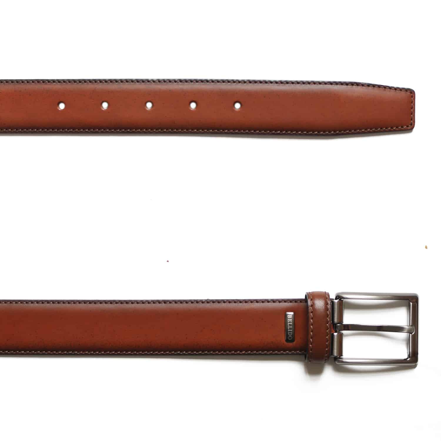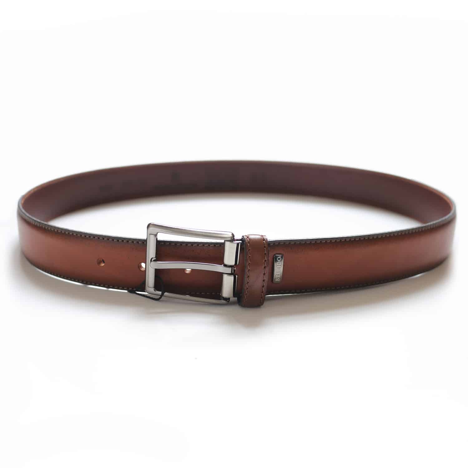 Tan belt with stitching around the edge of the belt while the buckle features a nickel and satin finish. It is ideal for navy trousers, even for ceremony.