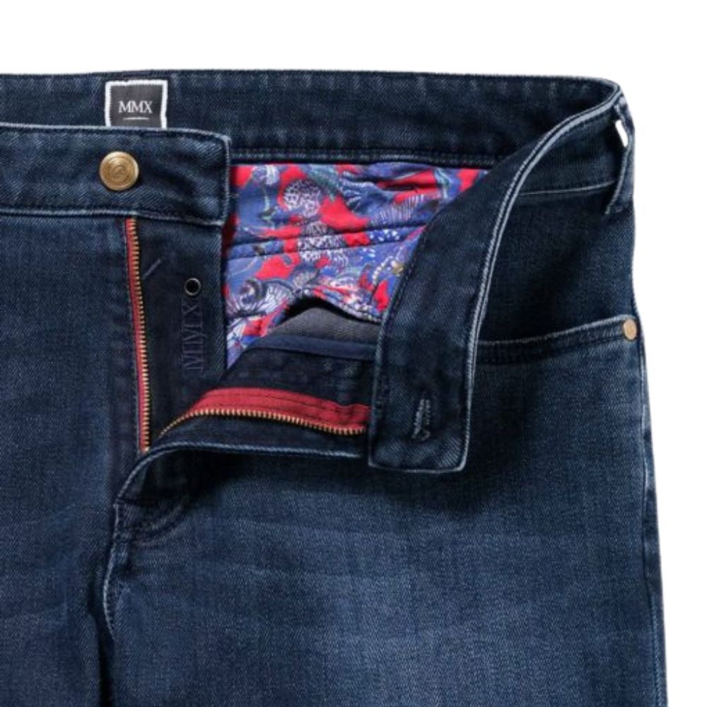 MMX Phoenix Jeans Slim Fit Blue washed finish are stretchy and expertly in a premium stretch cotton denim. the jeans offer a contemporary leg without compromising on comfort. Featuring a zip fly, five pockets, floral patterned lining, floral pin and a Swarovski crystal in the inner fly.