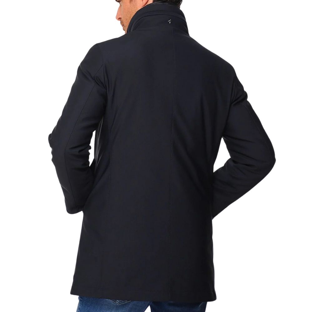 A navy-coloured, elegant, functional and high-tech men’s raincoat made of bi-stretch nylon with soft touch, thanks to the spiral spinning system. The ideal garment to face even the coolest and rainiest days in style, this men’s waterproof jacket is designed to brave the elements, given its high water proof performance. Moreover, it is unlined and finished on the inside with a contrasting colour elastic piping. These details make it a captivating raincoat, suitable for any look, formal or casual.
