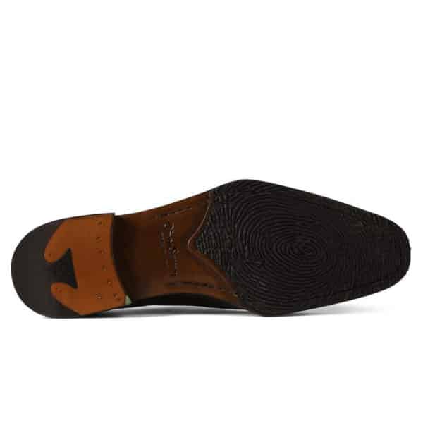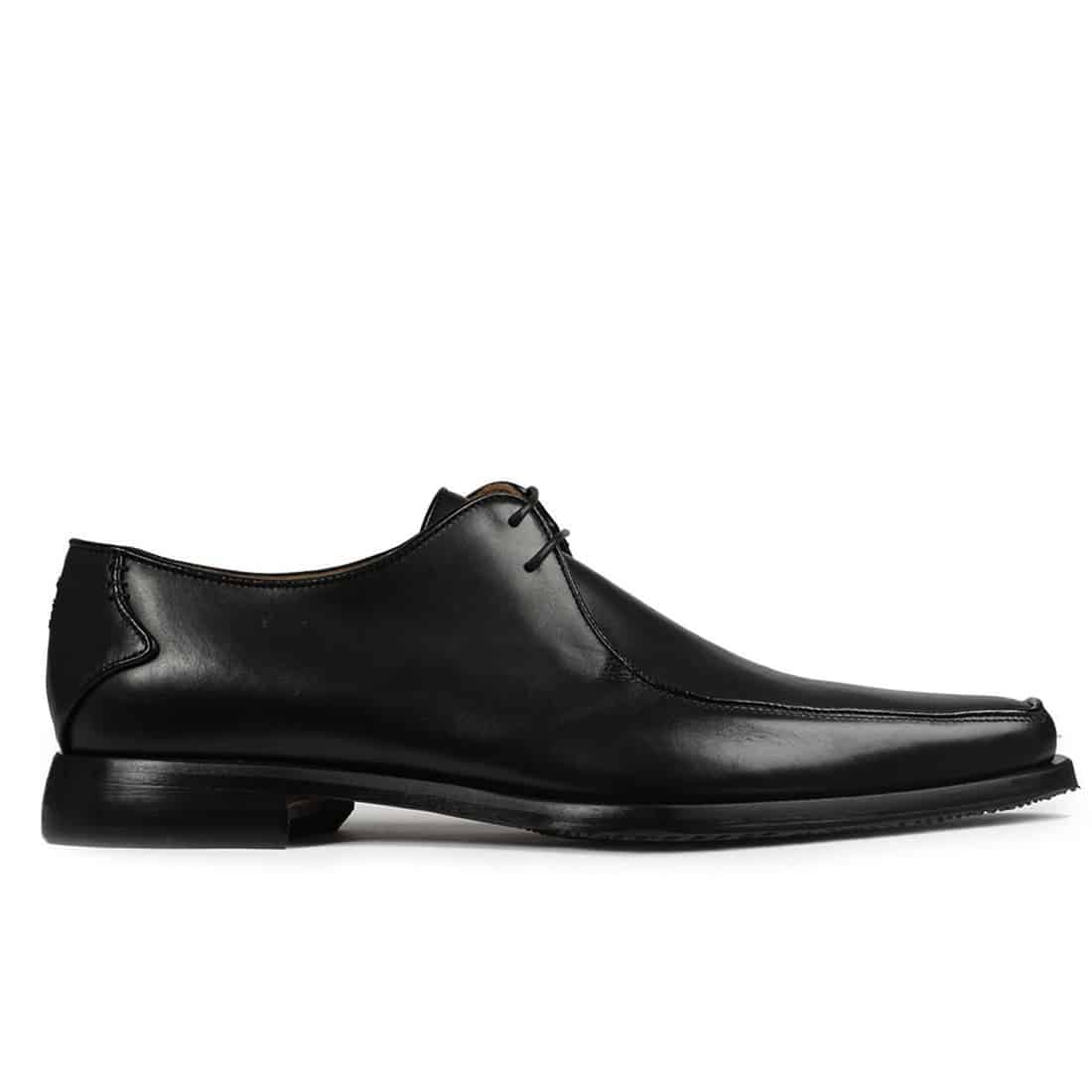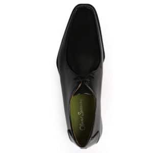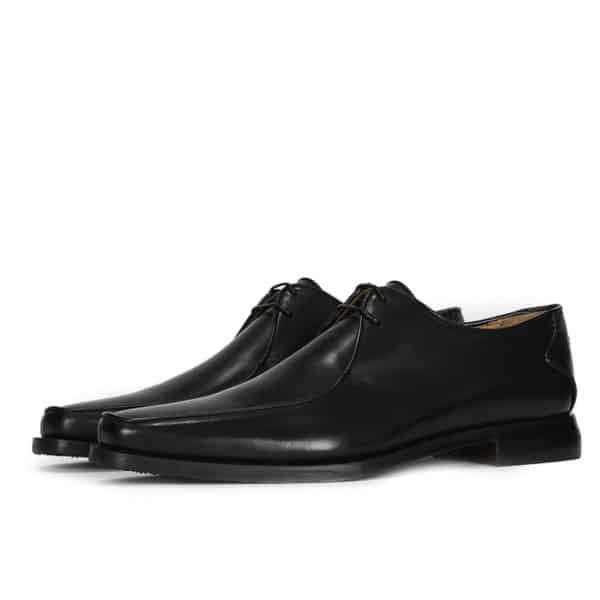 The Oliver Sweeney Napoli Black Calf Leather Derby shoe features 2 eye-lets, a large back counter with additional piping that follows through on the collar, tongue and apron. The additional refined piping offsets the strong angles of the kicked rand and squared-off toe, making this style suitable for both formalwear and work.