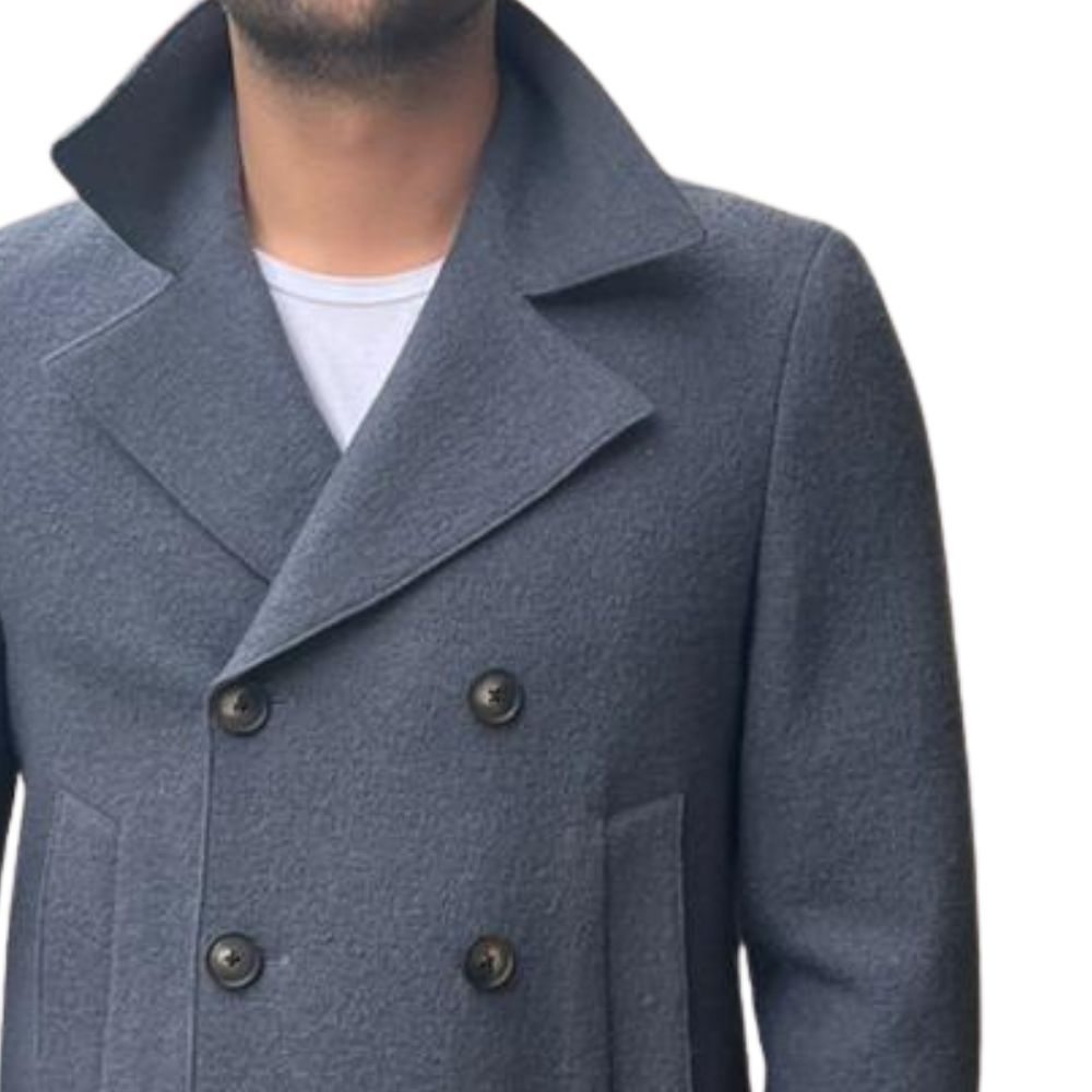 This Pal Zileri Virgin Wool Grey Double Breasted Peacoat is made from 100% soft textured virgin wool, with wide notch lapels, vertical slit pockets and double breasted wooden  button closure, single centre vent, two chest pockets, breathable lining