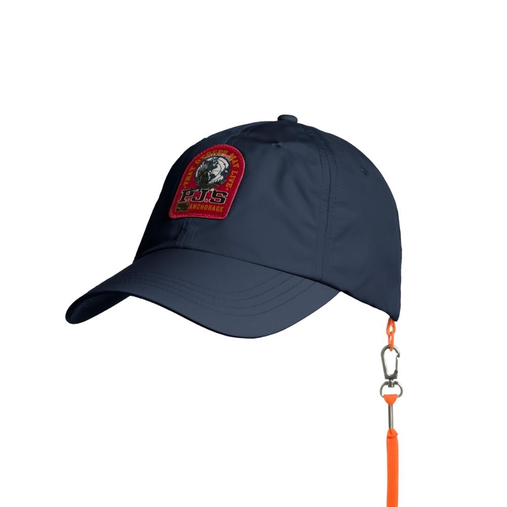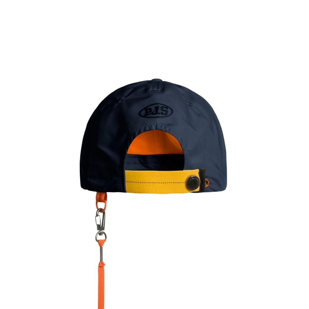 A practical waterproof cap. The fabric is 100% nylon oxford with fabric protector treatment and inner polyurethane lamination; the lining is a light orange cotton jersey. Rear PJS print and front iconic PJS patch. Orange tape detail with PJS rivet. Ventilation eyelets and removable storm strap. Adjustable iconic yellow elastic strap.