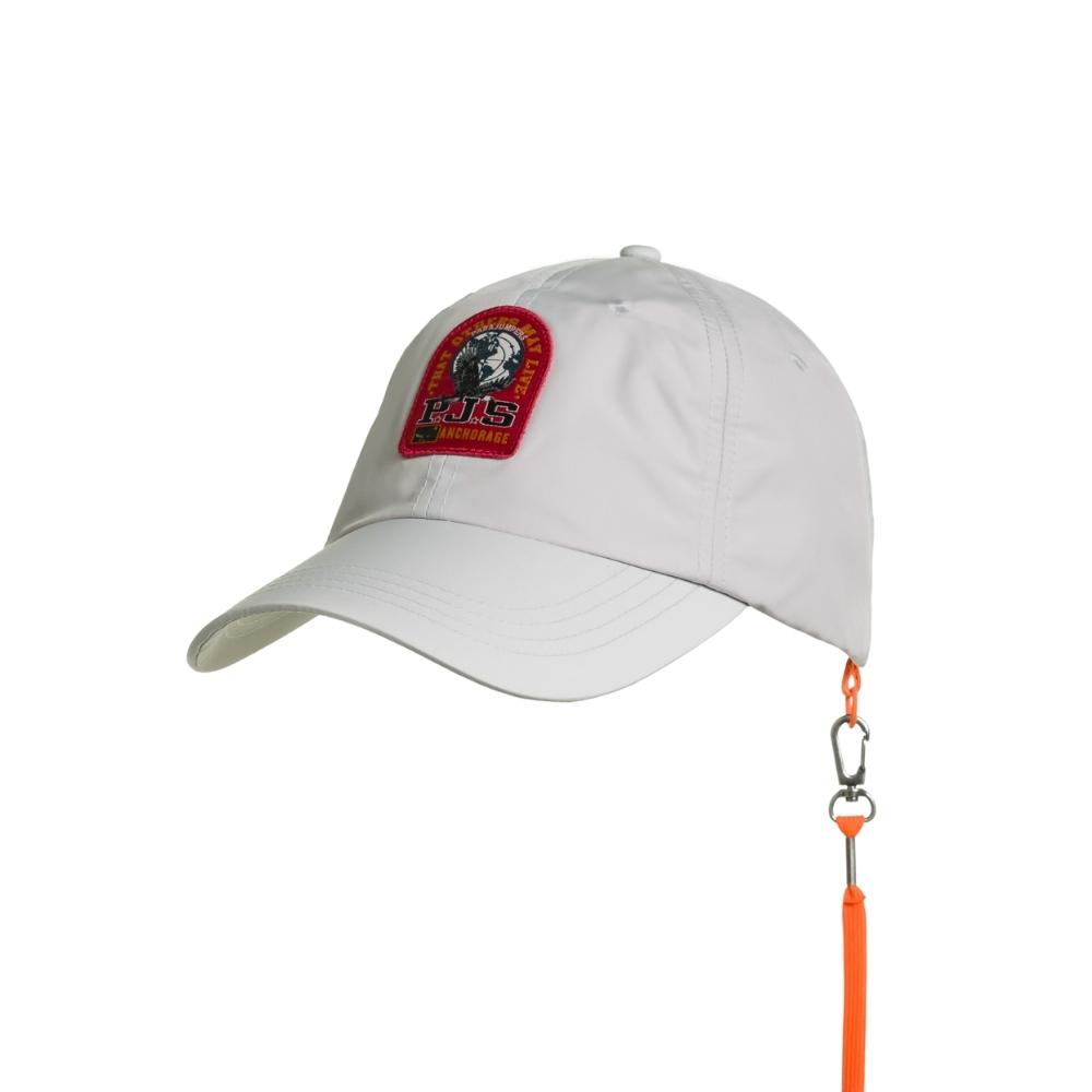 A practical waterproof cap. The fabric is 100% nylon oxford with fabric protector treatment and inner polyurethane lamination; the lining is a light orange cotton jersey. Rear PJS print and front iconic PJS patch. Orange tape detail with PJS rivet. Ventilation eyelets and removable storm strap. Adjustable iconic yellow elastic strap.