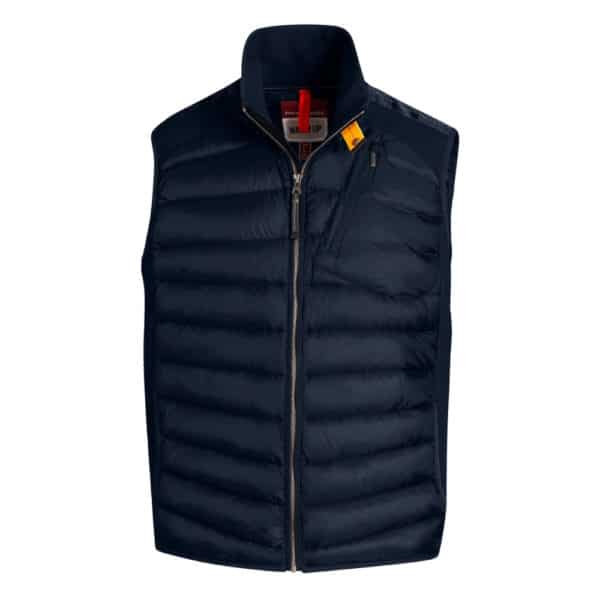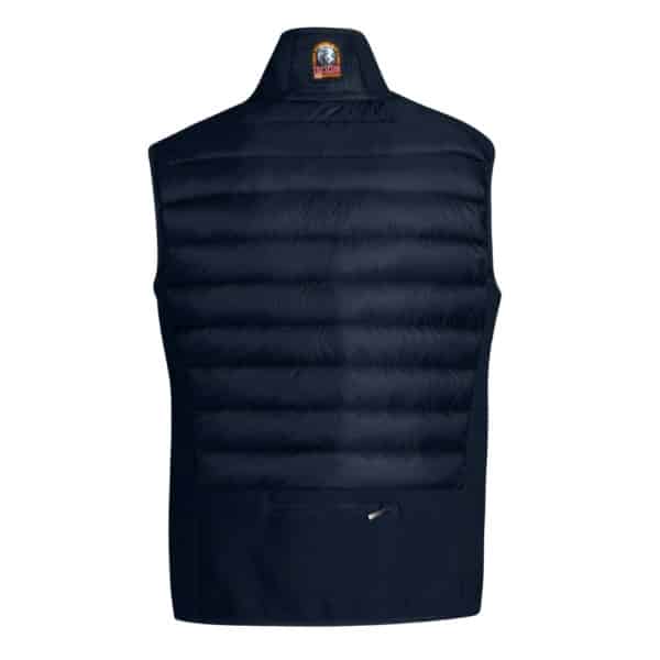 This gilet is made with a polyester honeycomb knit bonded with soft fleece on the inside and featuring down-filled 20 den nylon inserts. Three front pockets, a small zippered pocket at the back, as well as two inner pockets. Lycra trims. PJS patch at the back of the neck at the centre and elastic strap neck closure.