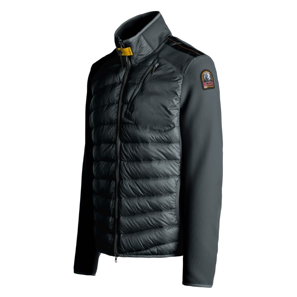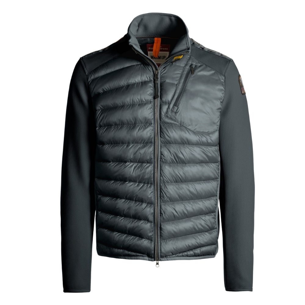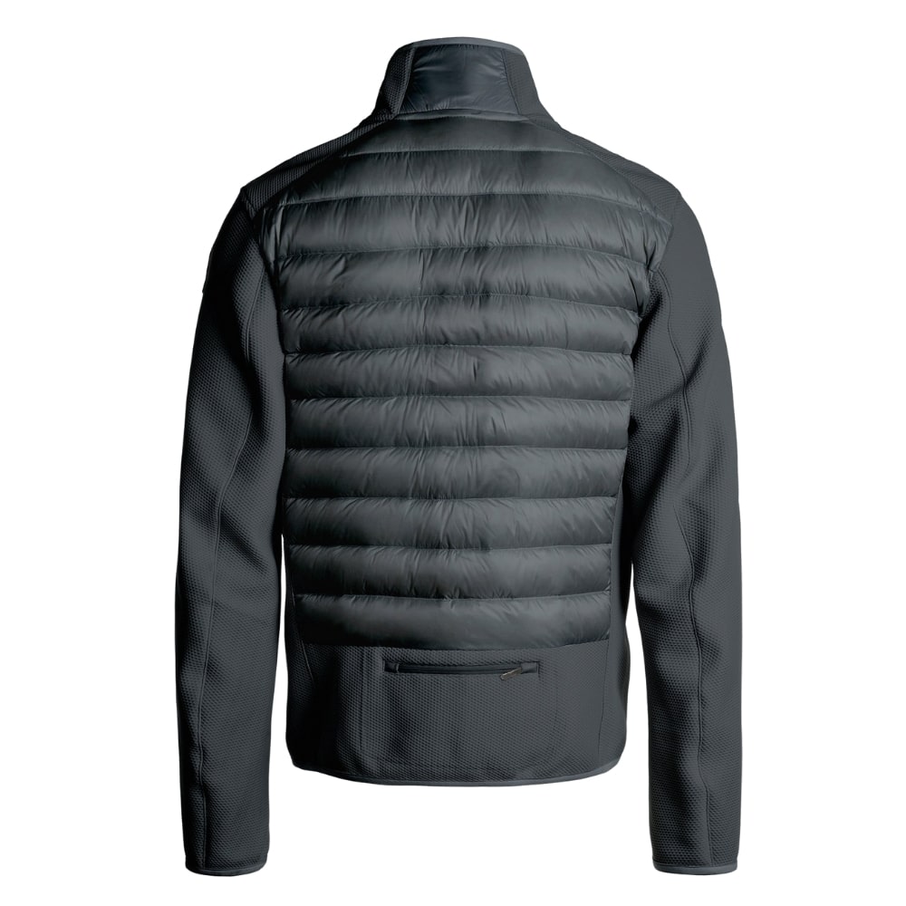 This hybrid is made of a polyester honeycomb knit bonded with soft fleece on the inside and featuring down-filled super light 20 den down proof semi-shiny taffeta inserts with water repellent treatment. Three front pockets, a small zippered pocket at the back, as well as two inner pockets. Two-way zipper. Lycra trimmed cuffs, bottom, collar, pockets. Underarm vents. Iconic yellow elastic strap neck closure and PJS patch on the left sleeve.