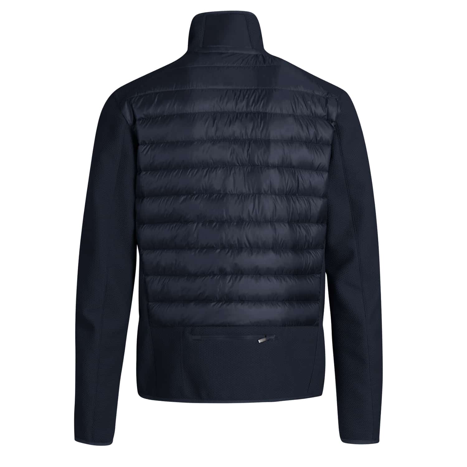 This hybrid is made of a polyester honeycomb knit bonded with soft fleece on the inside and featuring down-filled super light 20 den down proof semi-shiny taffeta inserts with water repellent treatment. Three front pockets, a small zippered pocket at the back, as well as two inner pockets. Two-way zipper. Lycra trimmed cuffs, bottom, collar, pockets. Underarm vents. Iconic yellow elastic strap neck closure and PJS patch on the left sleeve.