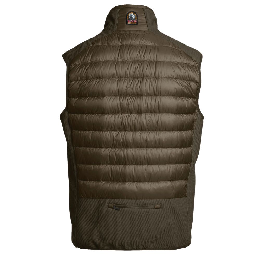 The Parajumpers Zavier Moss Green Gilet is a hybrid gilet vest that combines stretch polyester honeycomb with semi-shiny and down-proof nylon taffeta.