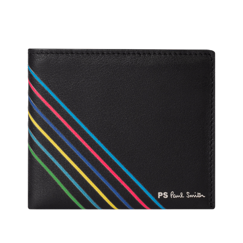 This Paul Smith black card wallet features a multi-colour diagonal stripe detail on the outside. It contains eight card slots, two smaller compartments for extra storage and a larger compartment for receipts and everyday notes. Made from 100% calf leather in Italy.