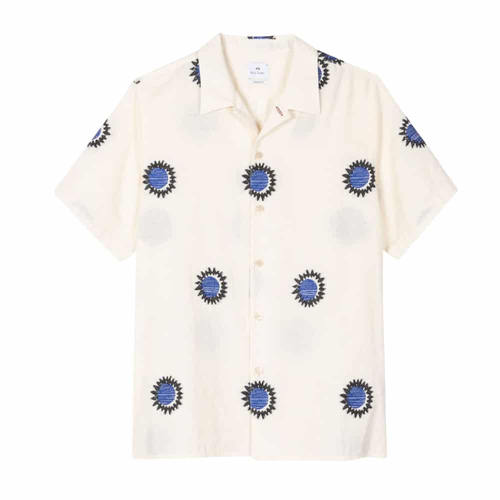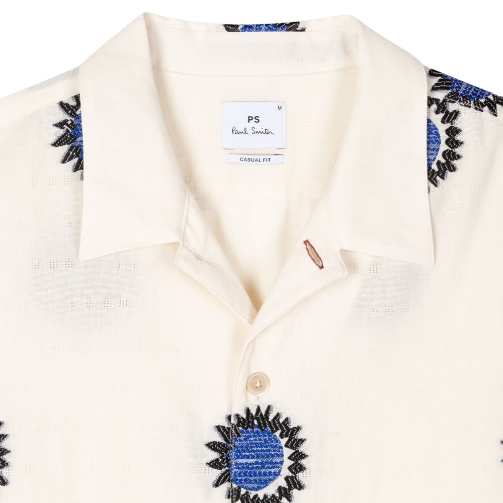 Made from a cotton-blend cloth for a lightweight finish, this white short-sleeve shirt features a fil coupé sun motif. Cut for a classic, casual-fit, this shirt is finished with a straight-cut hem and relaxed collar.