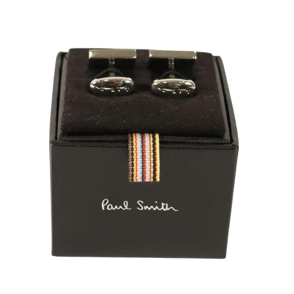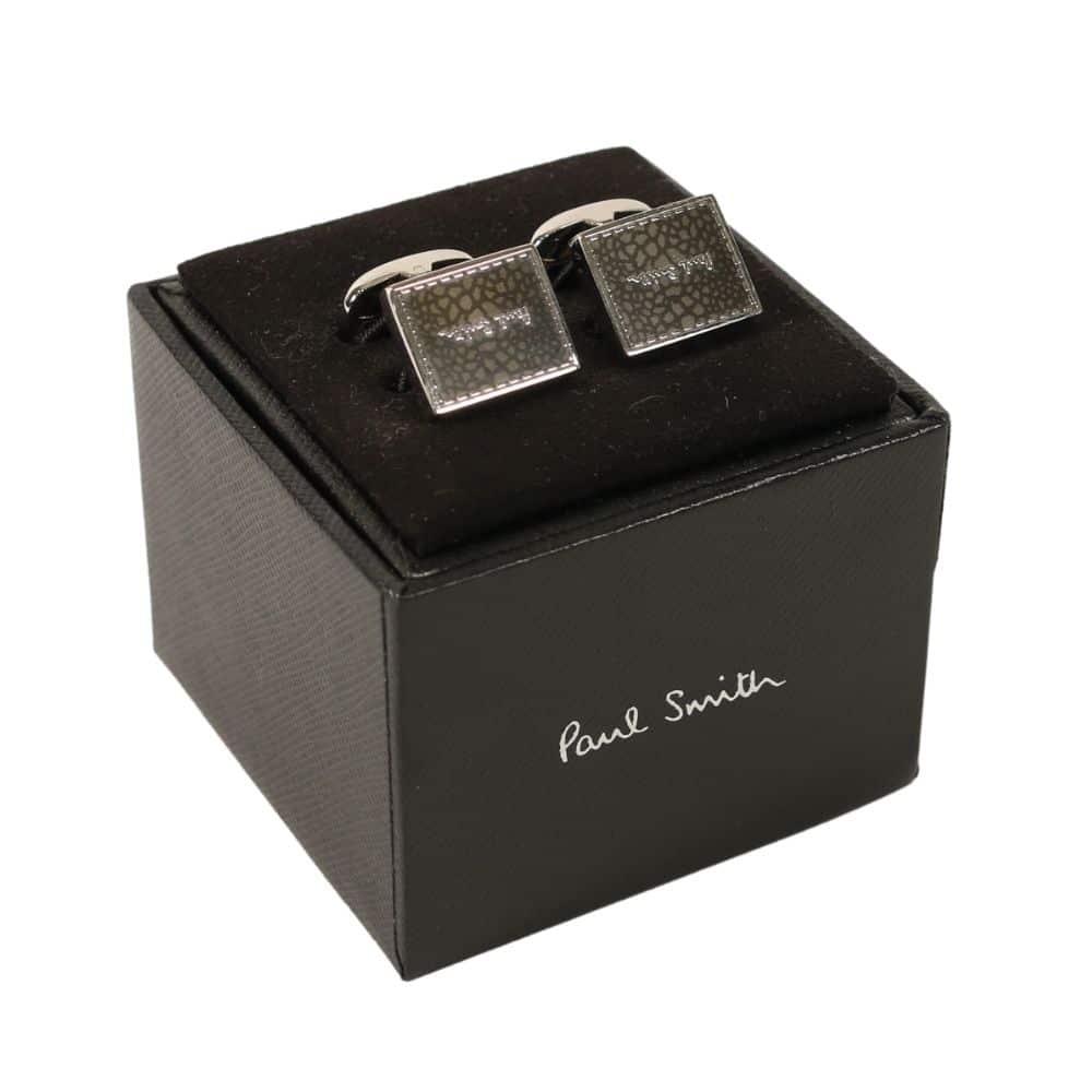 These Paul Smith Crocodile skin pattern Cufflinks in a rectangular shape are smart and sophisticated. They are crafted from Silver Toned enamel & feature a crocodile skin pattern in contrasting slate tone, with Paul Smith Branding. These cufflinks also feature a T-bar fastenings and presented in a branded black box.