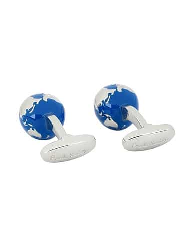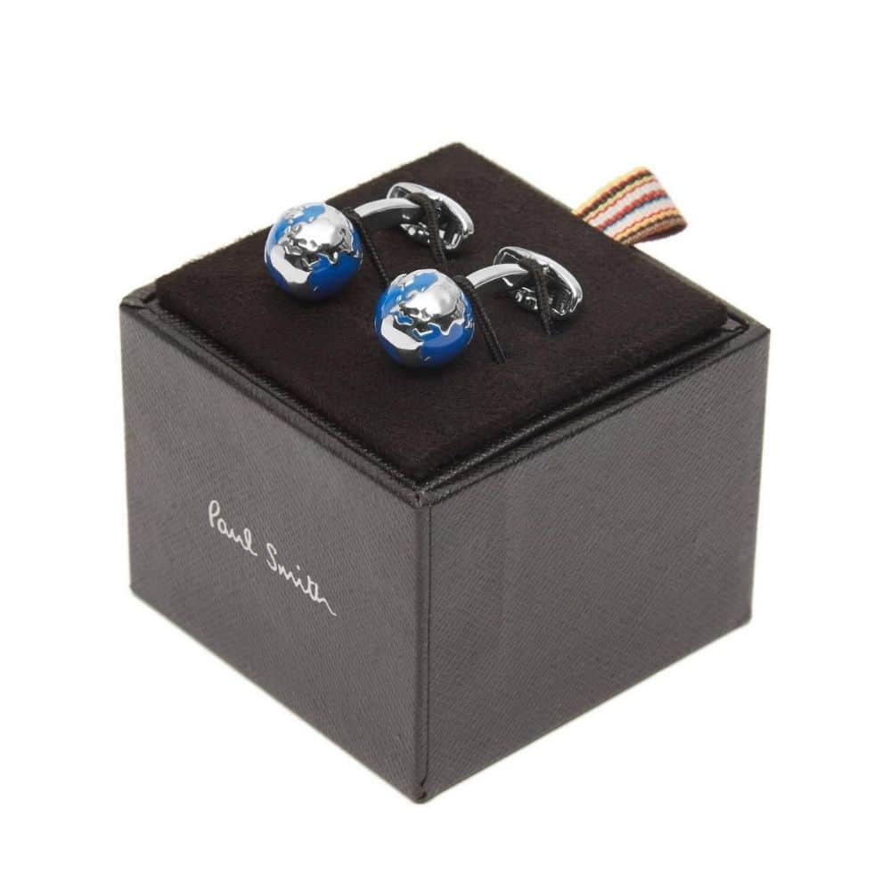 Paul Smith Globe Cufflinks – Inject some originality into your formal wardrobe with the Paul Smith globe cufflinks. Expertly crafted from a copper and brass mix, the cufflinks feature a 3-D globe design, with a polished silver finish and Paul Smith signature embossed T-bar fastenings. Presented in a black gift-box.