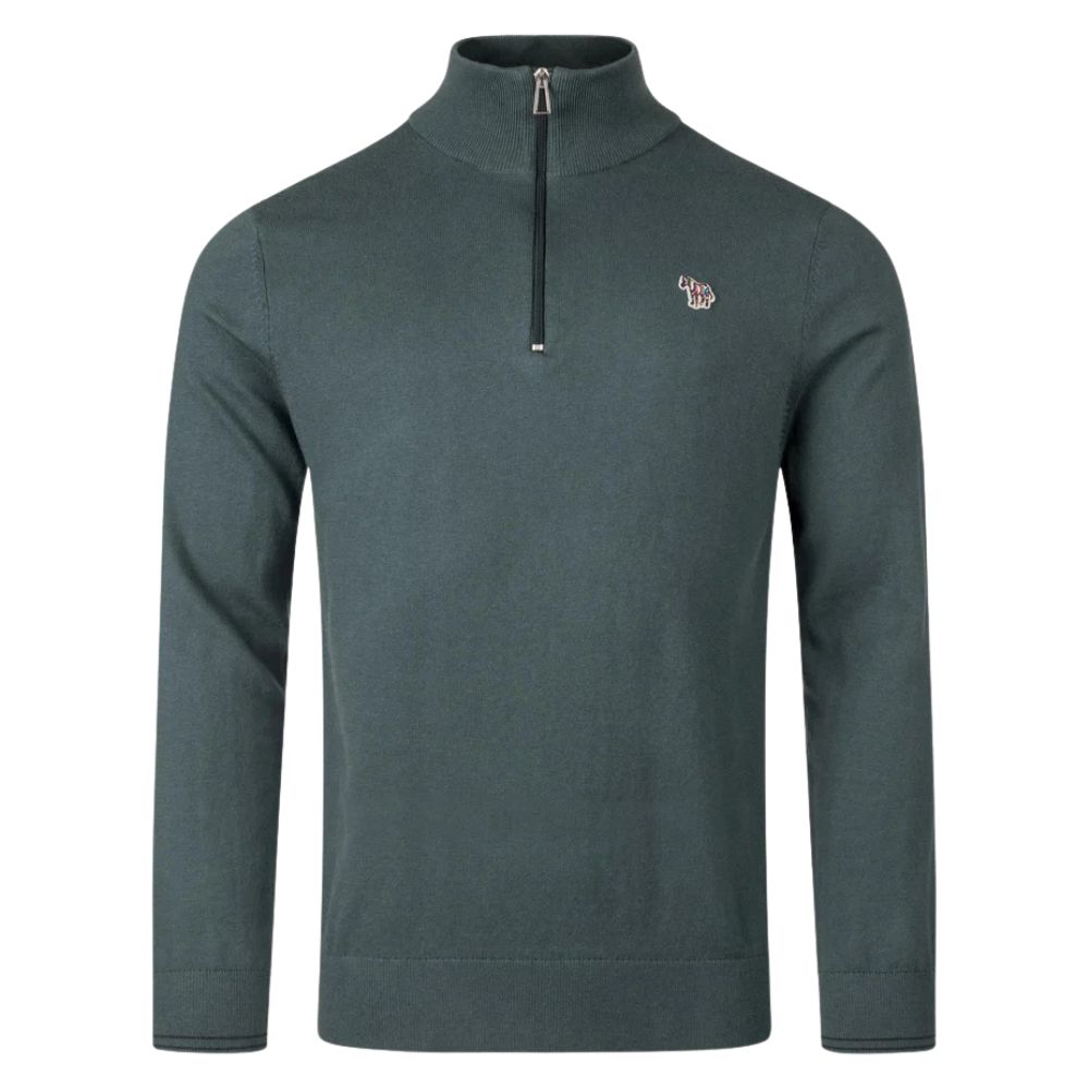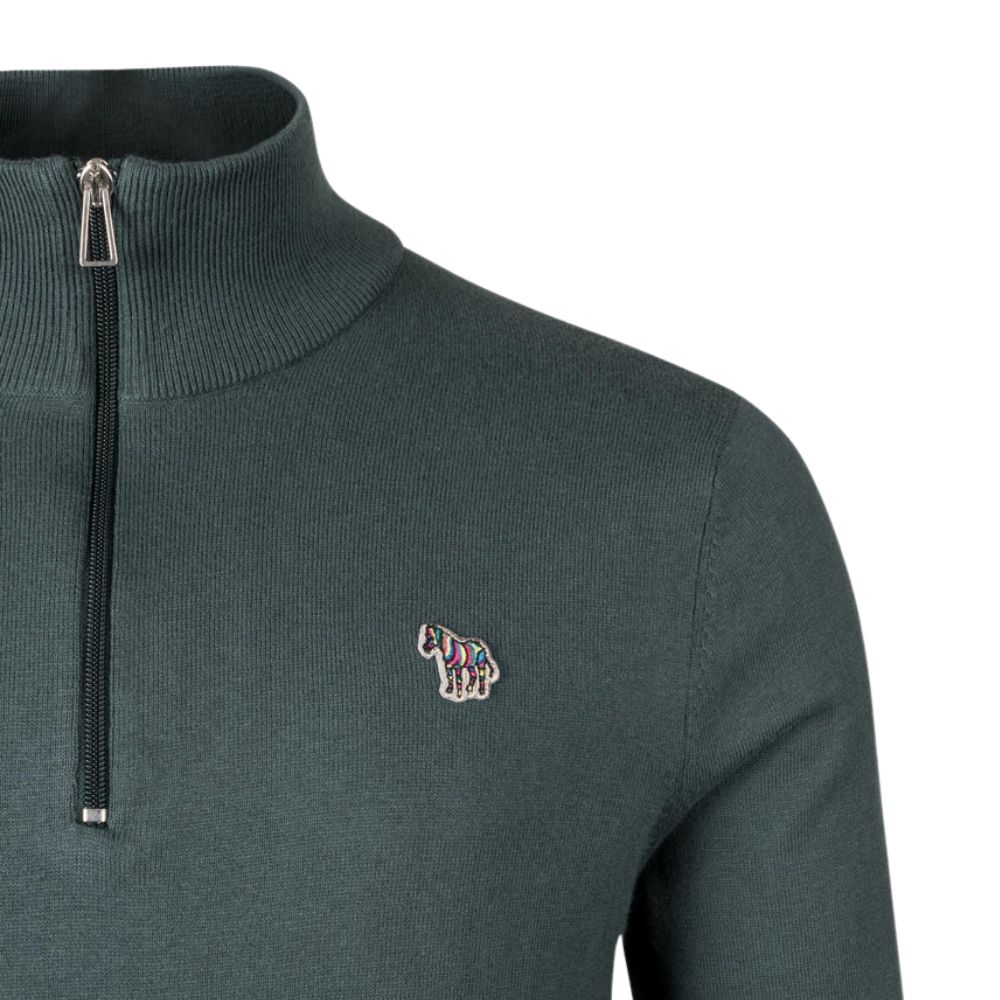 The Quarter Zip Zebra Logo Jumper by PS Paul Smith, drops this season in a Petrol Green colourway. Primed for the transitional season, it pairs perfectly with your casual or workwear wardrobe for an effortless and elevated style. Crafted from a soft cotton, nylon, and wool-blend for maximum comfort. Detailed with a ribbed funnel neck, cuffs, hems, and signature zebra logo stitched on the chest. Finished with subtle stripe tipping on the cuffs.