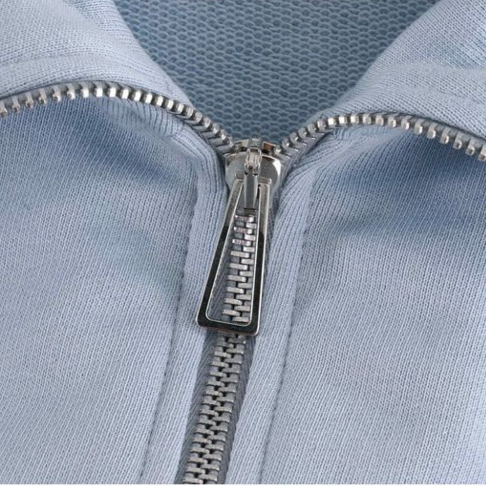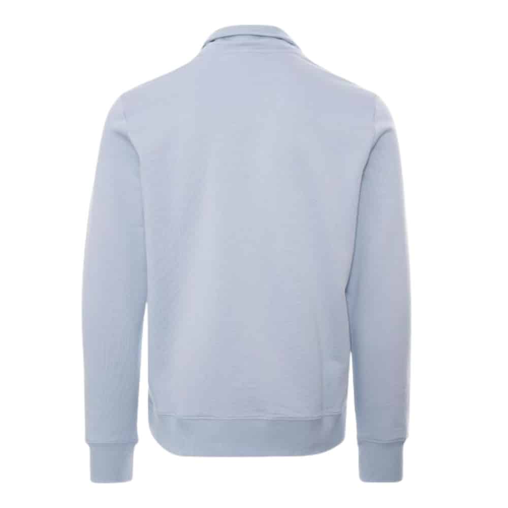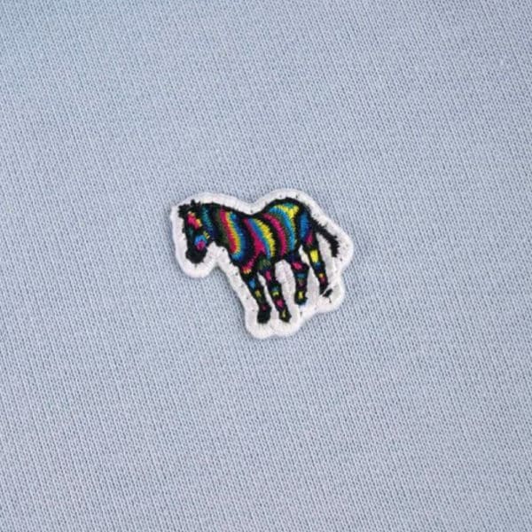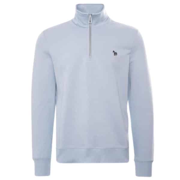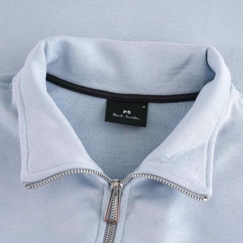 This Paul Smith light blue Half Zip is made from 100% cotton, features a zip fastening funnel neck and classic Zebra logo on the chest. Finished with teal coloured inner collar, ribbed cuffs and waistband.
