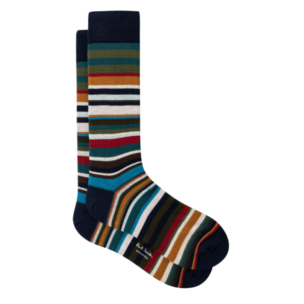 Made in Italy from a soft cotton-blend, these socks feature a mullti-colour stripe throughout and a navy base.