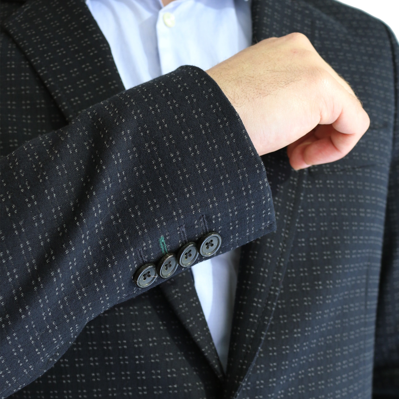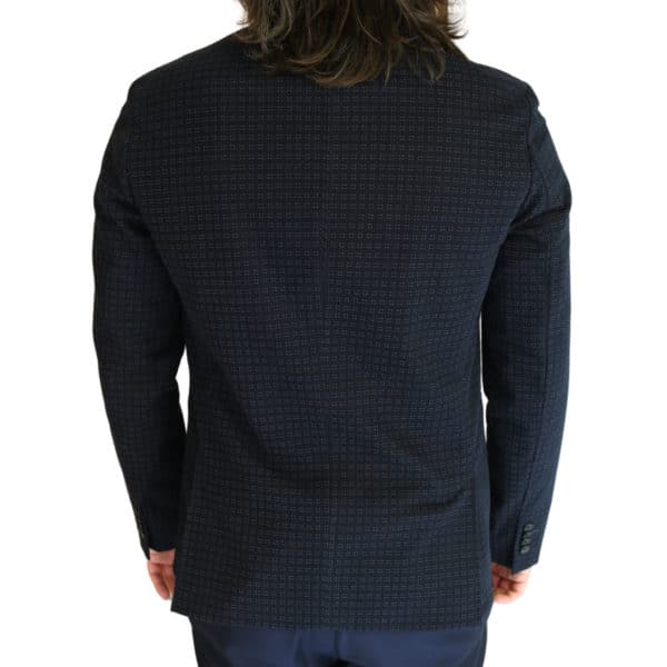 Paul Smith dot pattern Navy jacket, unlined, with a two button closure, two side pockets, one breast pocket, and four buttons on the cuffs.