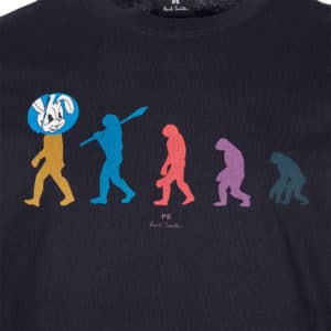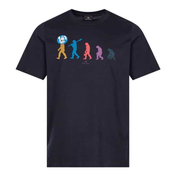 Paul Smith navy evolution print t-shirt in regular fit with a ribbed collar. A classic crew neck t-shirt by Paul Smith featuring a multi-colour evolution print positioned across the chest. Made from 100% cotton.